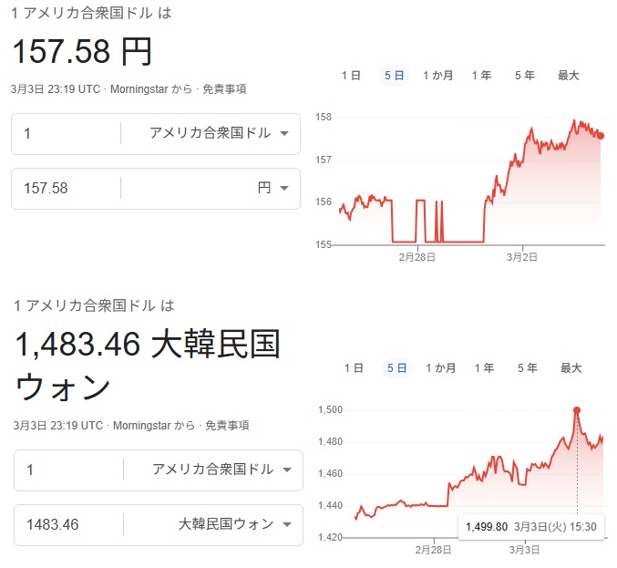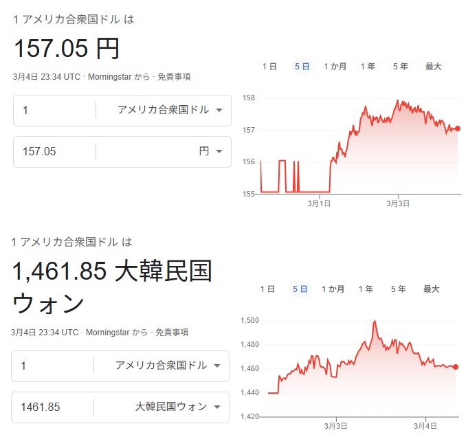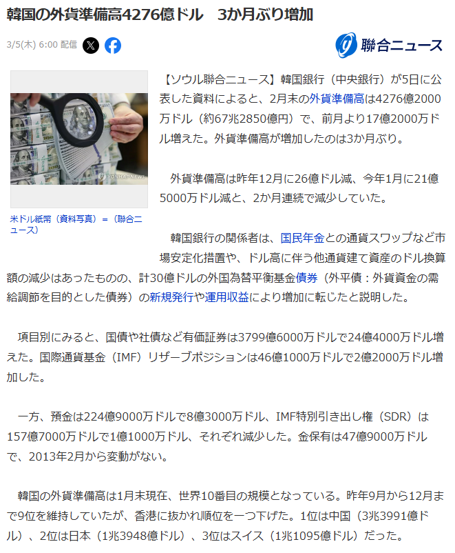 | … | 917無題Name名無し 26/03/05(木)08:35:48No.785241そうだねx2 1772667348915.png-(166773 B) 外貨準備高が増えたニダ(多分昨日ほとんど溶けた) |