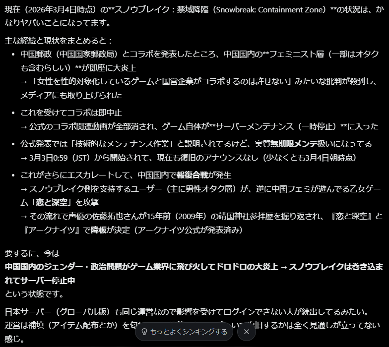 | … | 76無題Name名無し 26/03/01(日)15:04:45No.784234+>今やAI君もどこのAIに何をどう聞いたかとかくらいは出さんと |