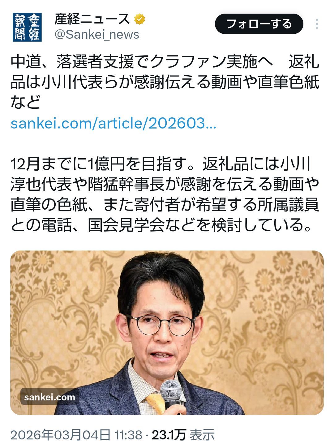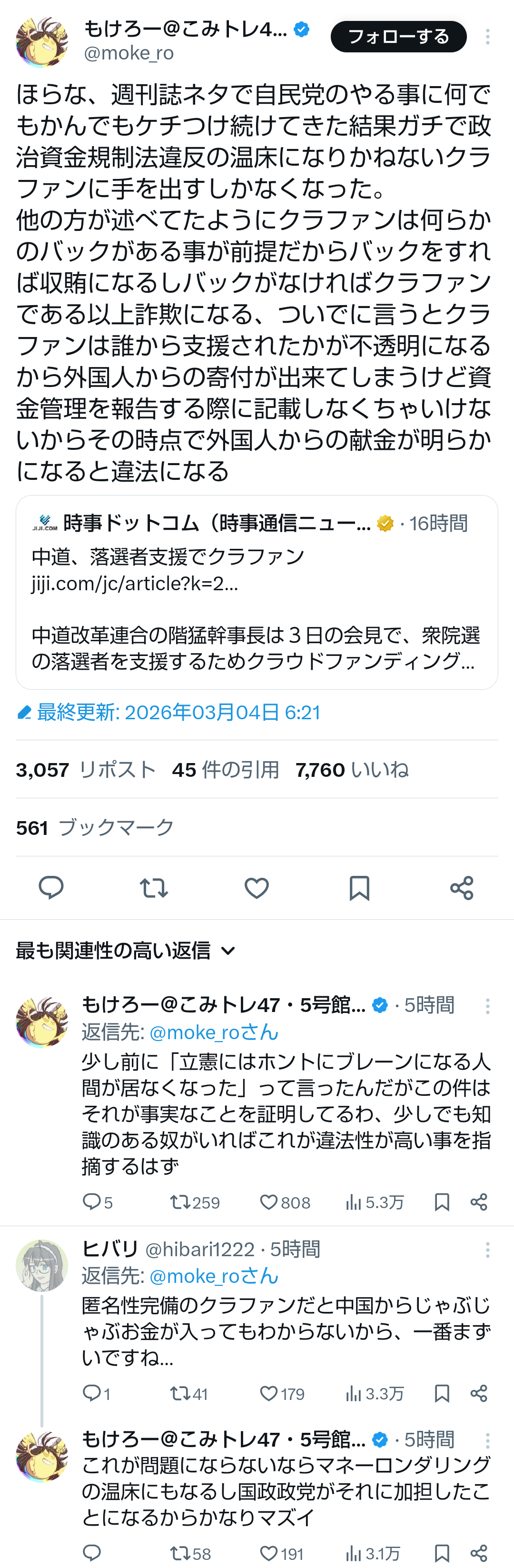 | … | 914無題Name名無し 26/03/05(木)07:49:11No.785238そうだねx1クラファン自体が寄付金扱いだとしても外国人が寄付しても区別出来ない匿名性にクラファンプラットフォーム業者への手数料が利益供与や贈収賄に与えるかのグレーゾーン等素人考えだけでも問題点が複数個即出て来る程度には政治資金に活用する手段として不適当な点が多過ぎるよねぇ・・・ |