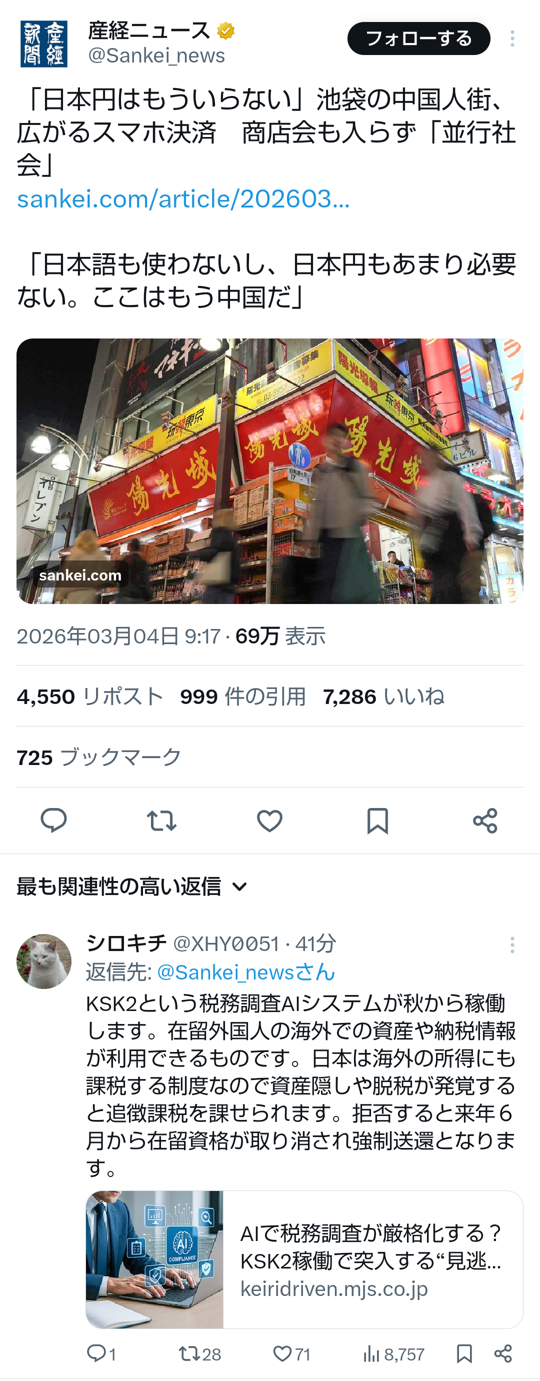 | … | 48無題Name名無し 26/03/01(日)14:04:25No.784199そうだねx2>外国人が増えることがよいと思ってる人が多かったり本当かなって部分もあるけど |