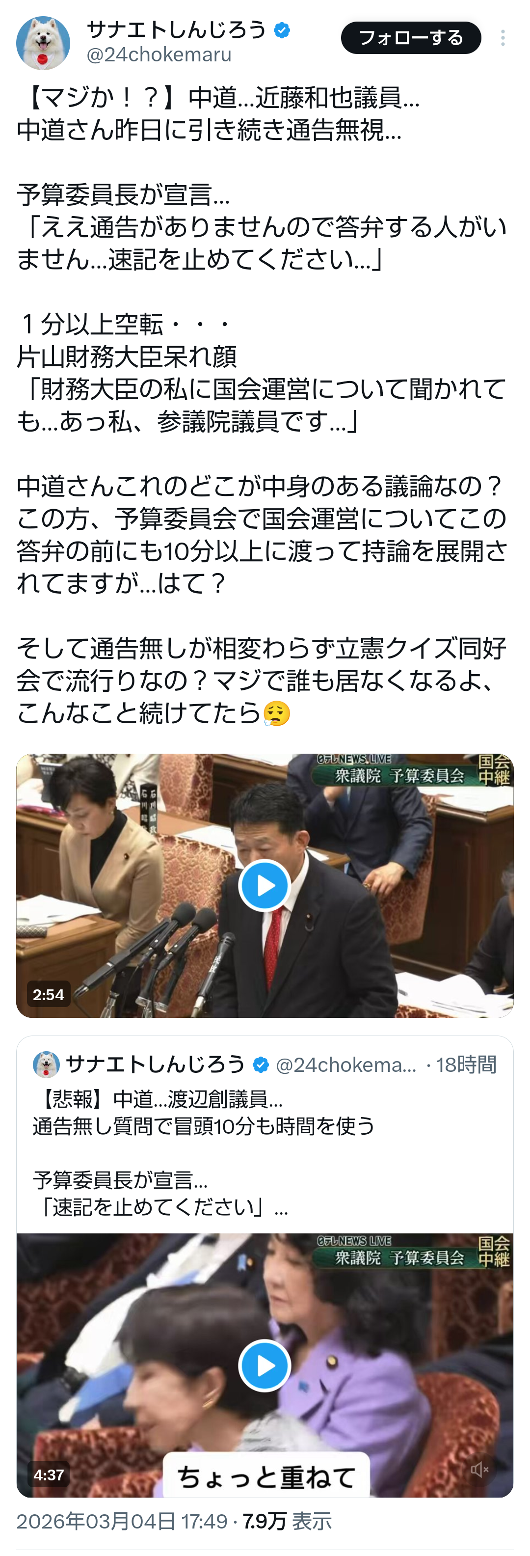 | … | 71無題Name名無し 26/03/01(日)14:49:08No.784229+議員って地方の有力者(社長医師弁護士)上がりなことも多いからそういう人間は座って質問とかが当たり前になっている人も多いだろうし |