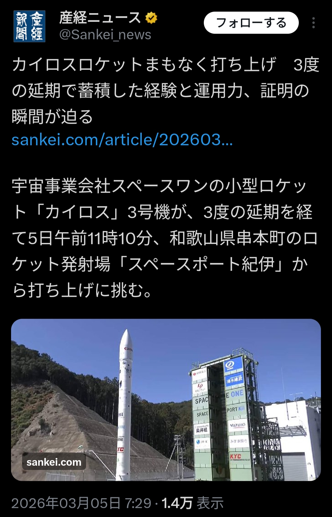 | … | 12無題Name名無し 26/03/01(日)12:57:57No.784163+和歌山のロケットは天候問題で延期かぁ |