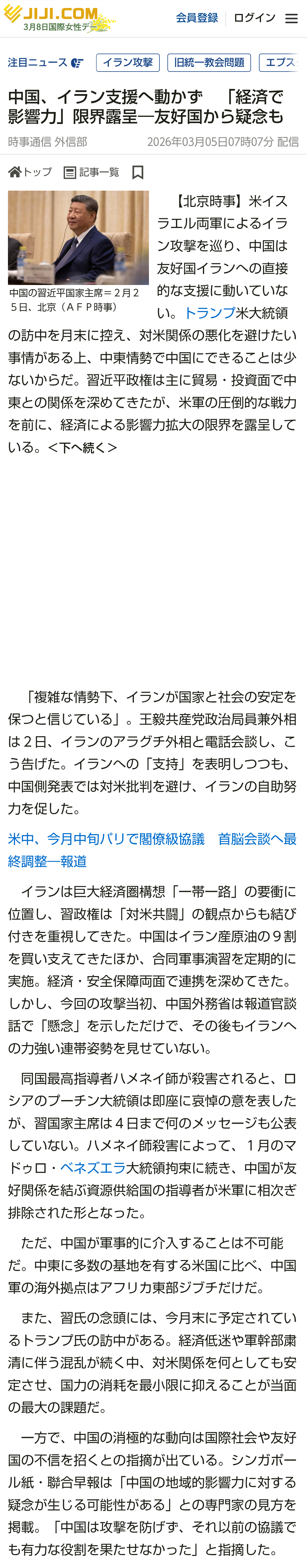 | … | 959無題Name名無し 26/03/05(木)12:14:01No.785286+ 1772680441671.png-(1318187 B) >中国、イラン支援へ動かず 「経済で影響力」限界露呈―友好国から疑念も |