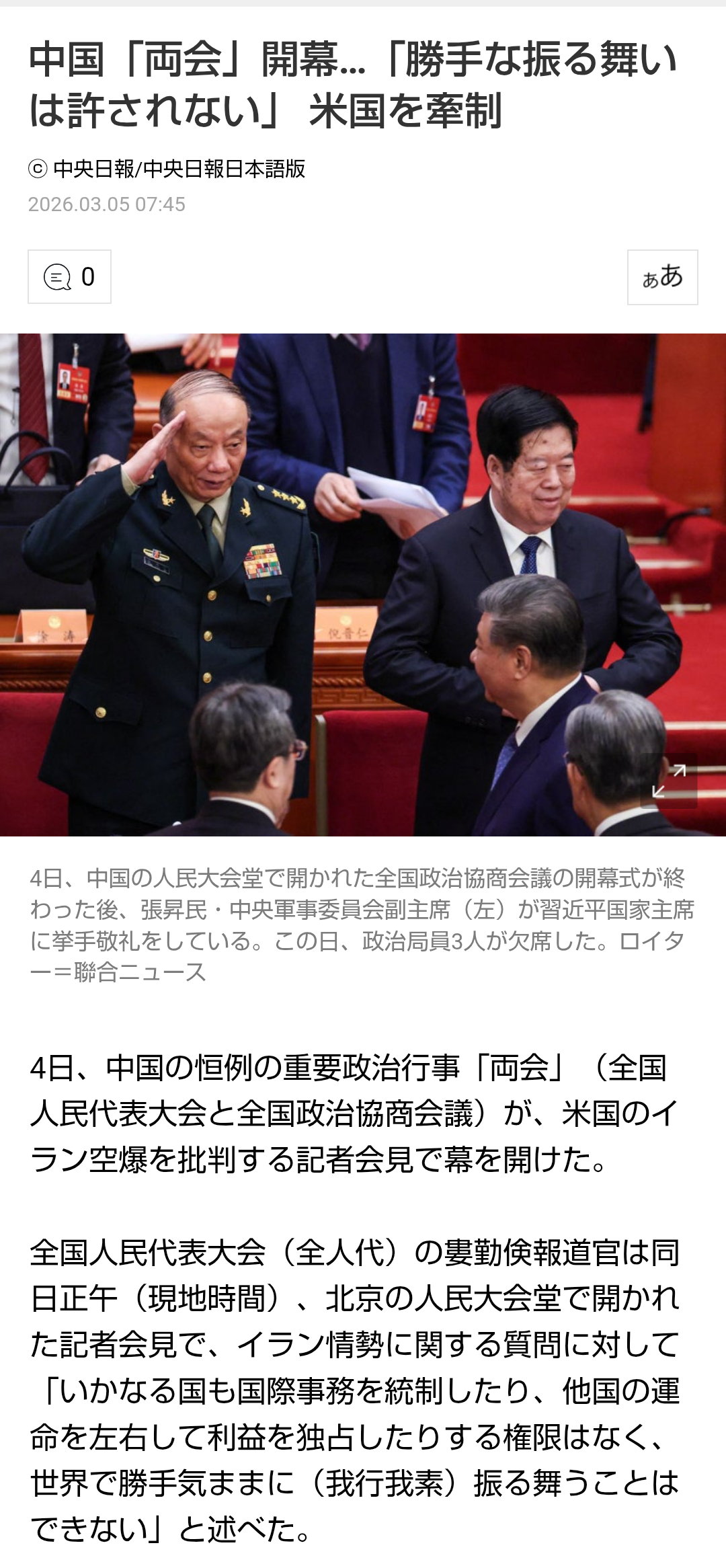 | … | 977無題Name名無し 26/03/05(木)13:14:27No.785304+ 1772684067404.png-(1262696 B) >中国「両会」開幕…「勝手な振る舞いは許されない」 米国を牽制 |