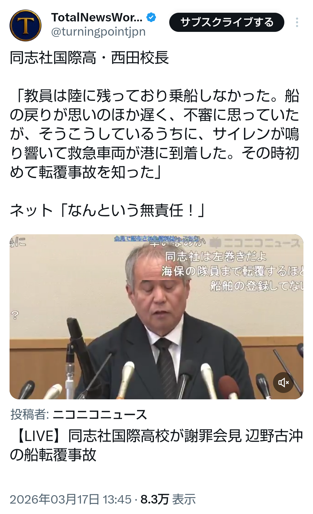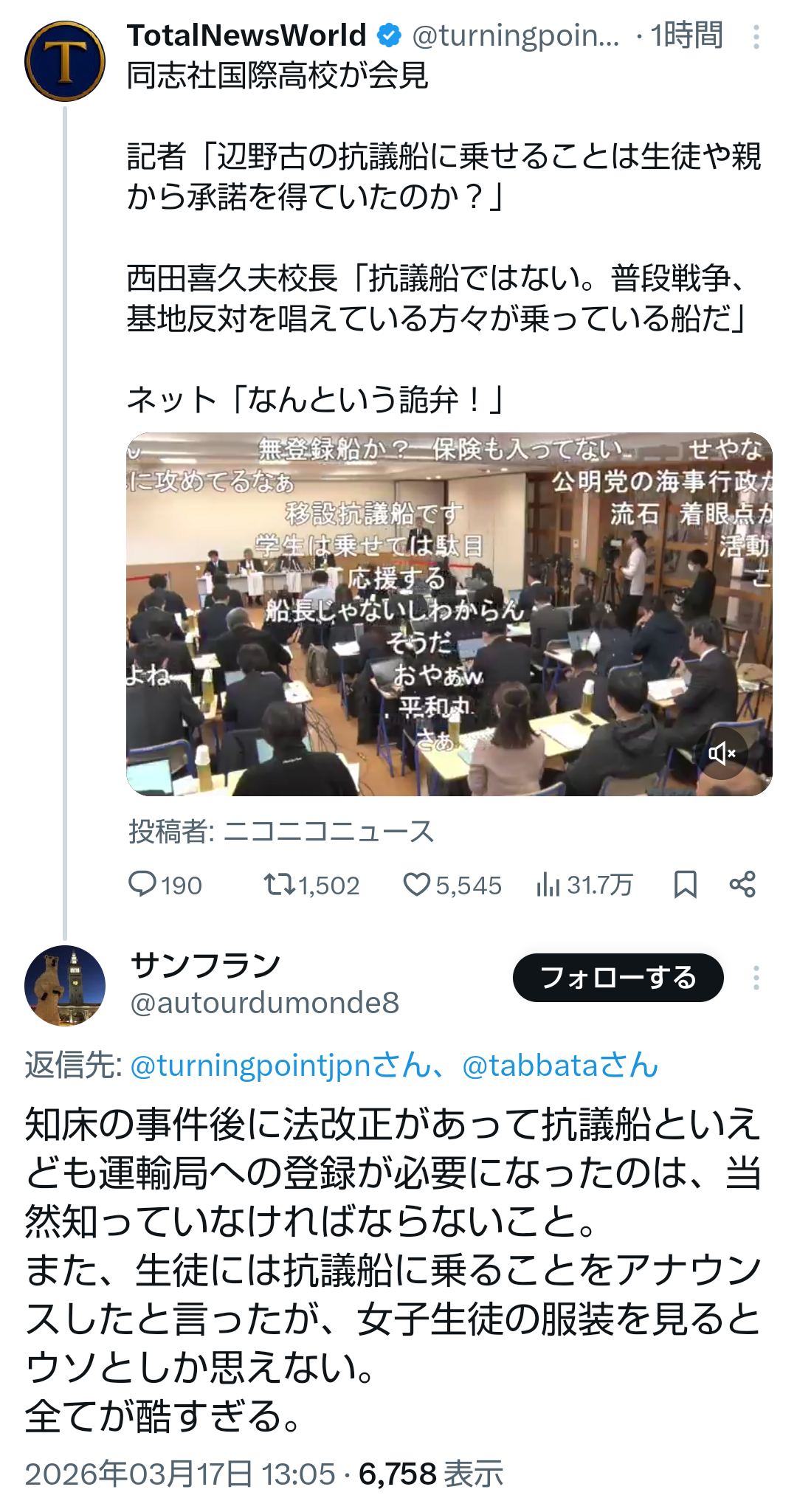 | … | 3無題Name名無し 26/03/17(火)13:52:45No.787574そうだねx6 1773723165790.png-(1725012 B) >「辺野古の抗議船に乗船することは生徒や親から承諾を得ていたのか?」2022年のKAZU I 沈没事故に触れ記者が質問 同志社国際高校が謝罪会見 |