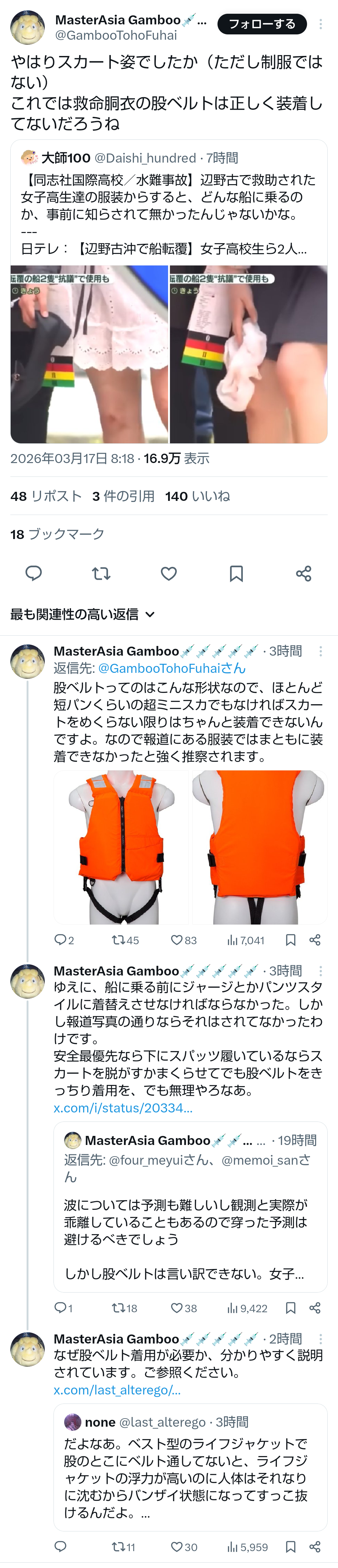 | … | 9無題Name名無し 26/03/17(火)14:01:31No.787580そうだねx4>スカートだと救命胴衣ちゃんとつけられてなかったのでは?という意見も |