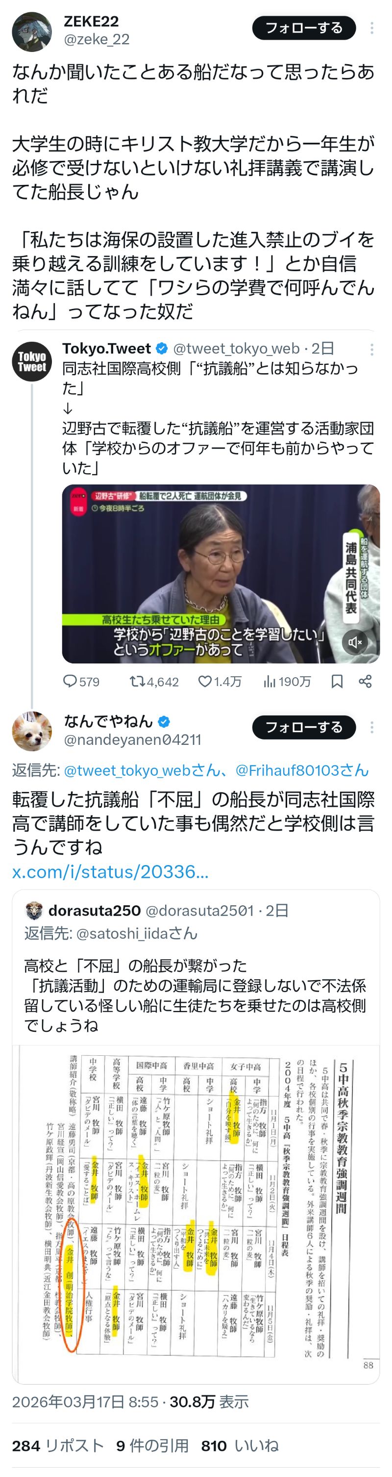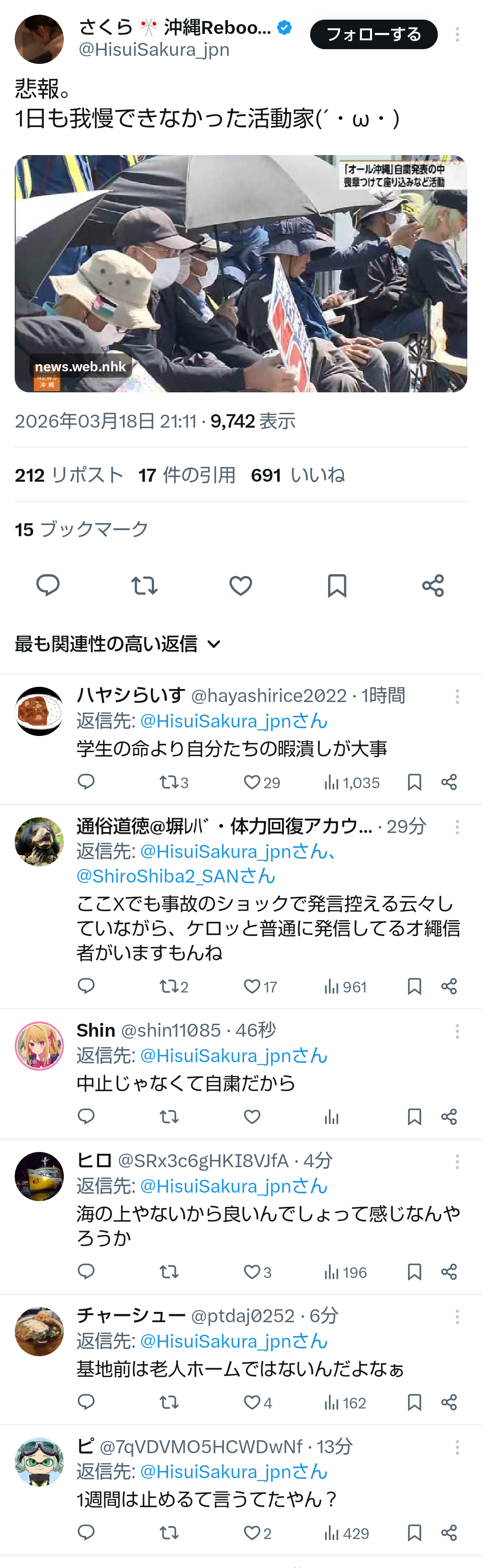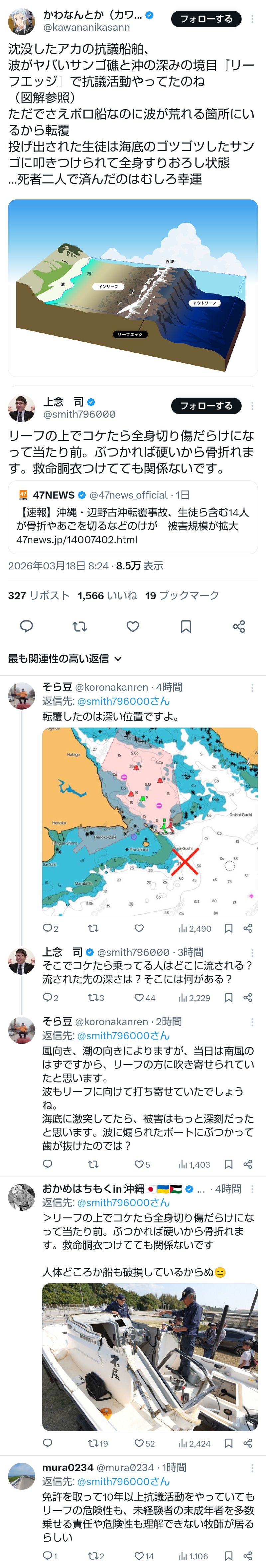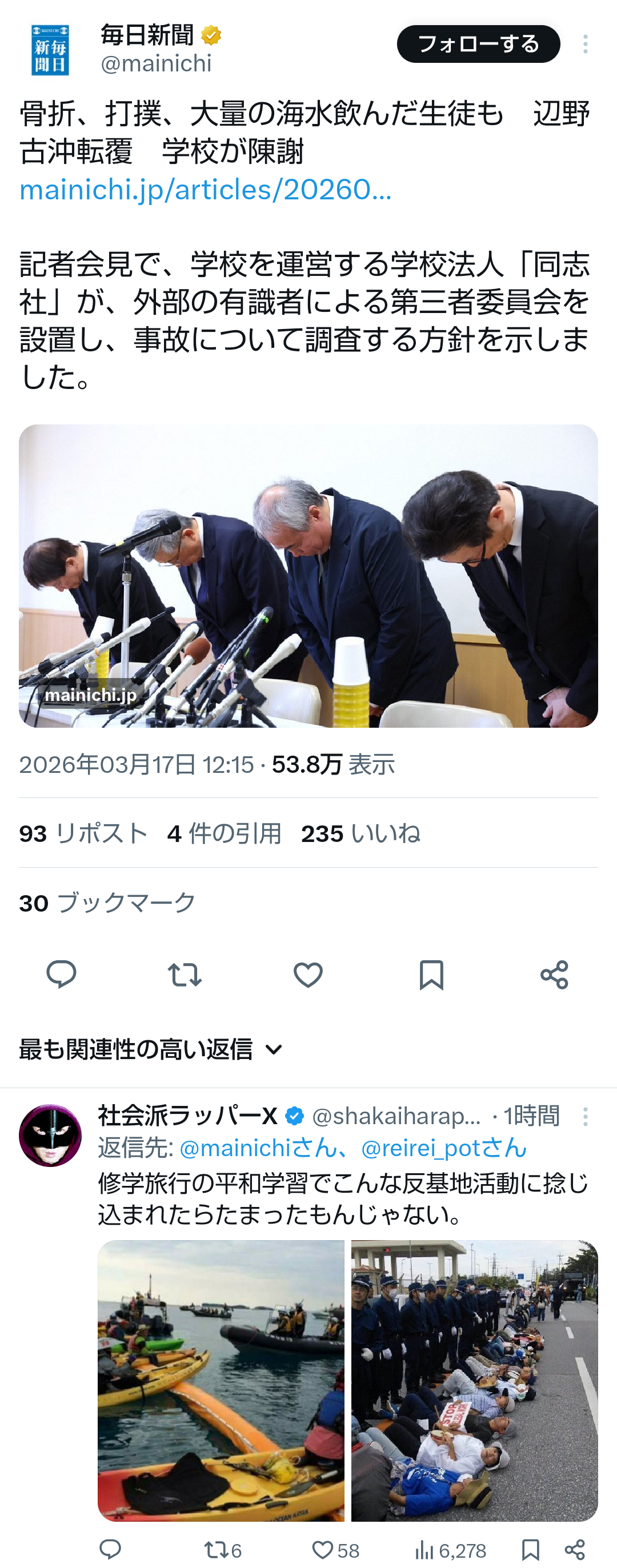 | … | 27無題Name名無し 26/03/17(火)15:05:20No.787606そうだねx2 1773727520491.png-(1636701 B) >骨折、打撲、大量の海水飲んだ生徒も 辺野古沖転覆 学校が陳謝 |