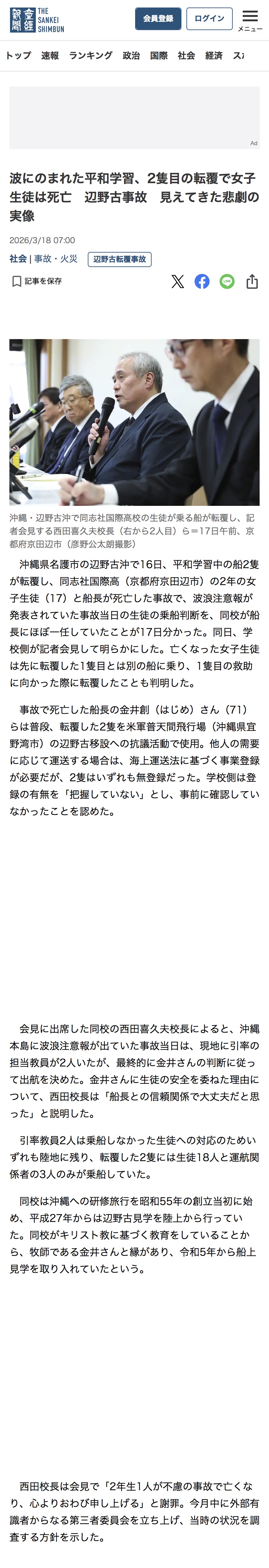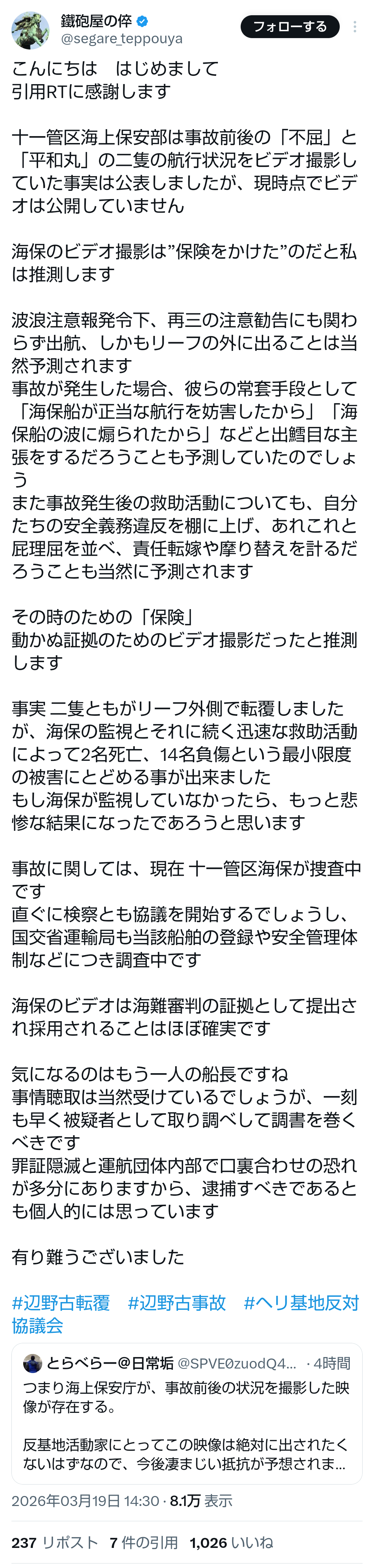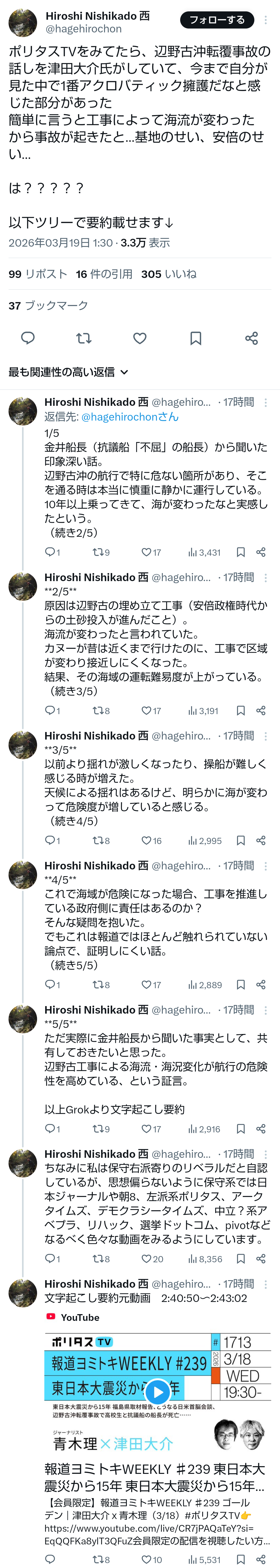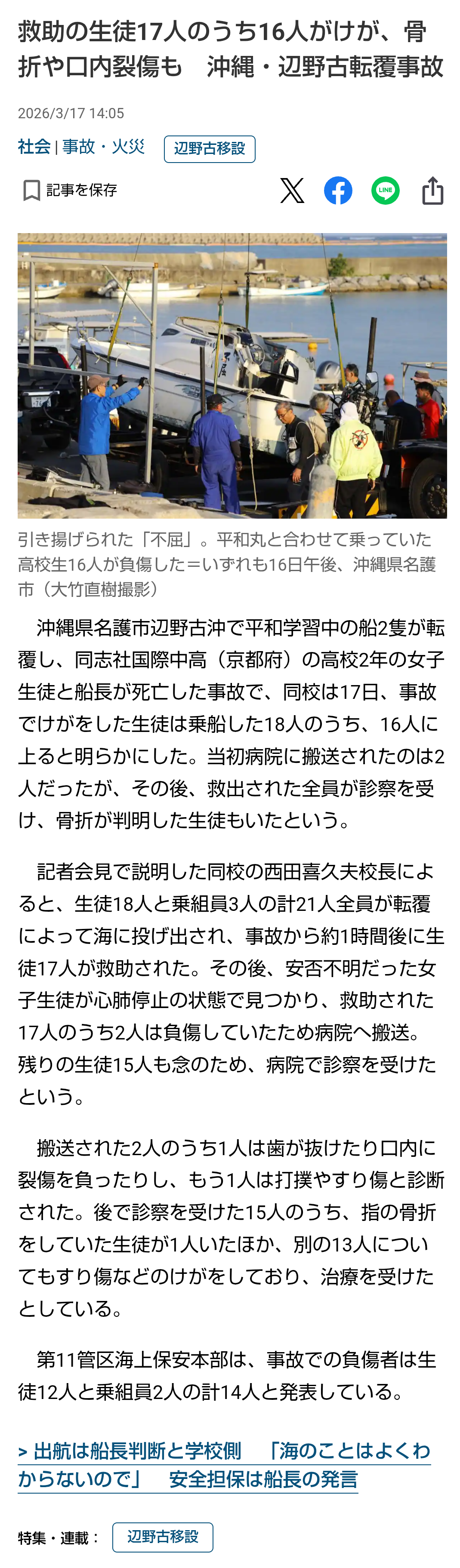 | … | 27無題Name名無し 26/03/17(火)15:05:20No.787606そうだねx2 1773727520491.png-(1636701 B) >骨折、打撲、大量の海水飲んだ生徒も 辺野古沖転覆 学校が陳謝 |