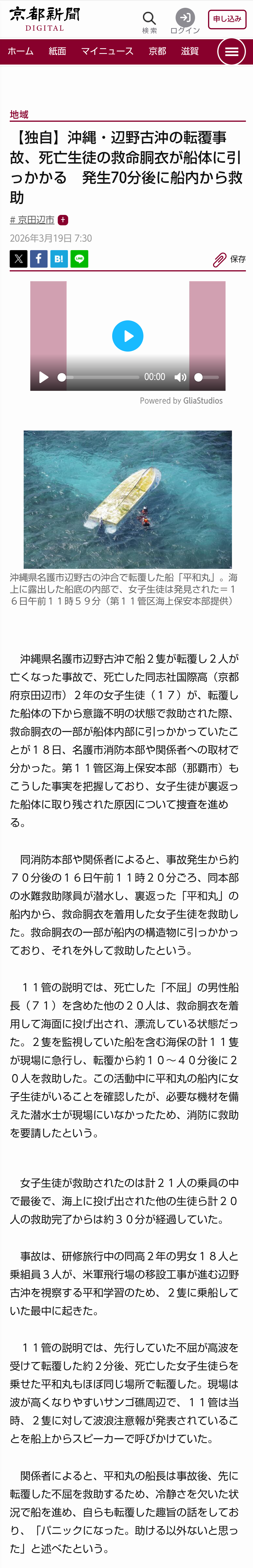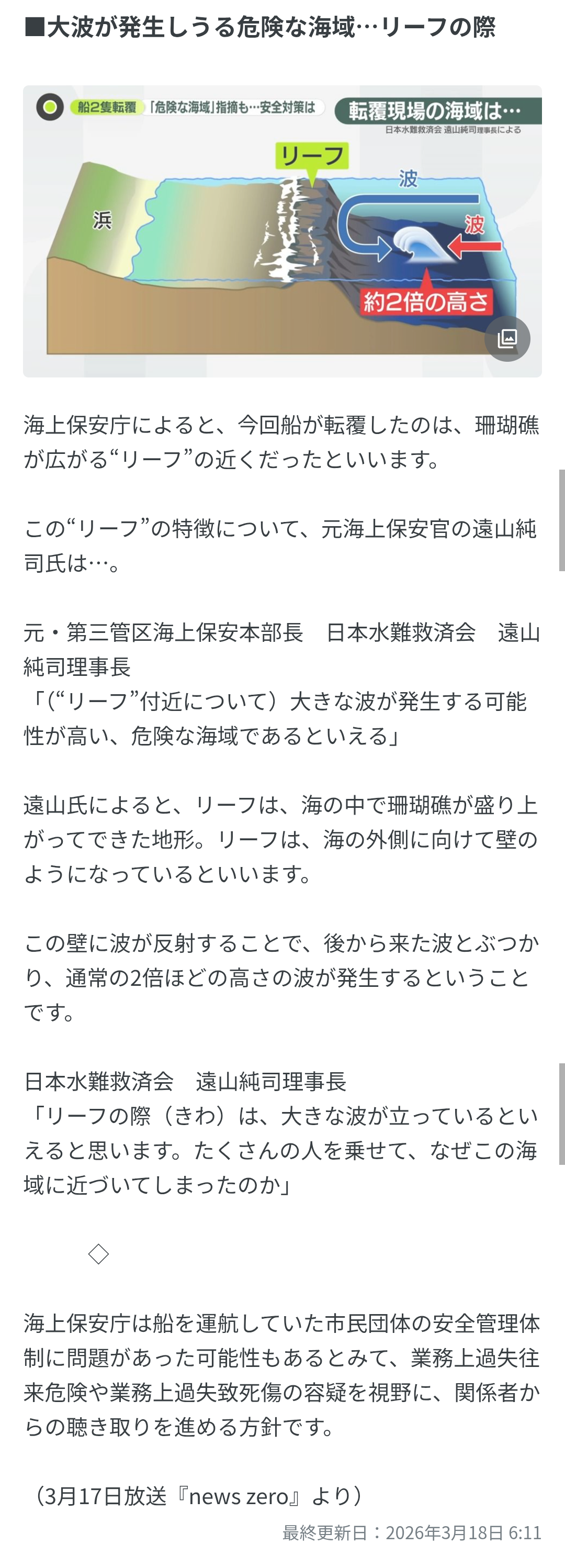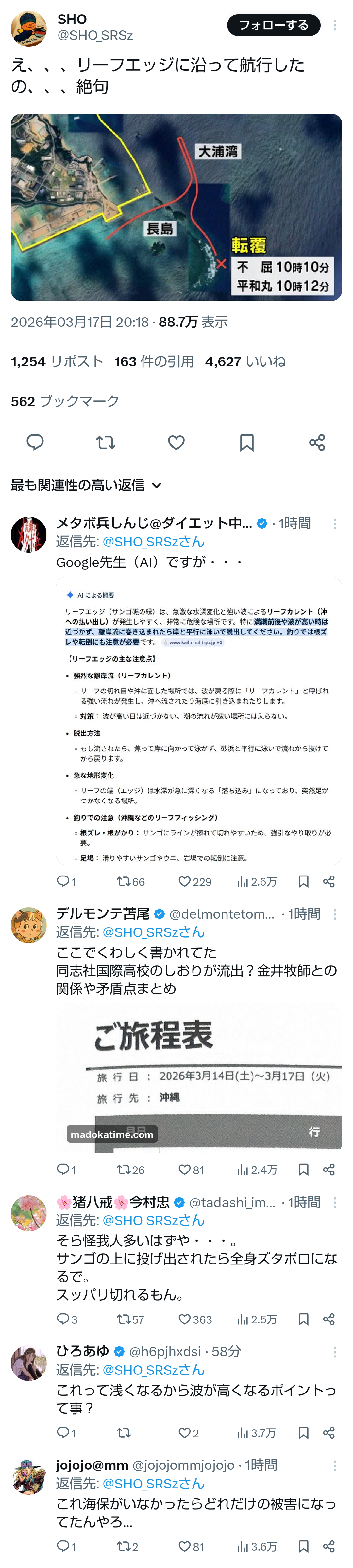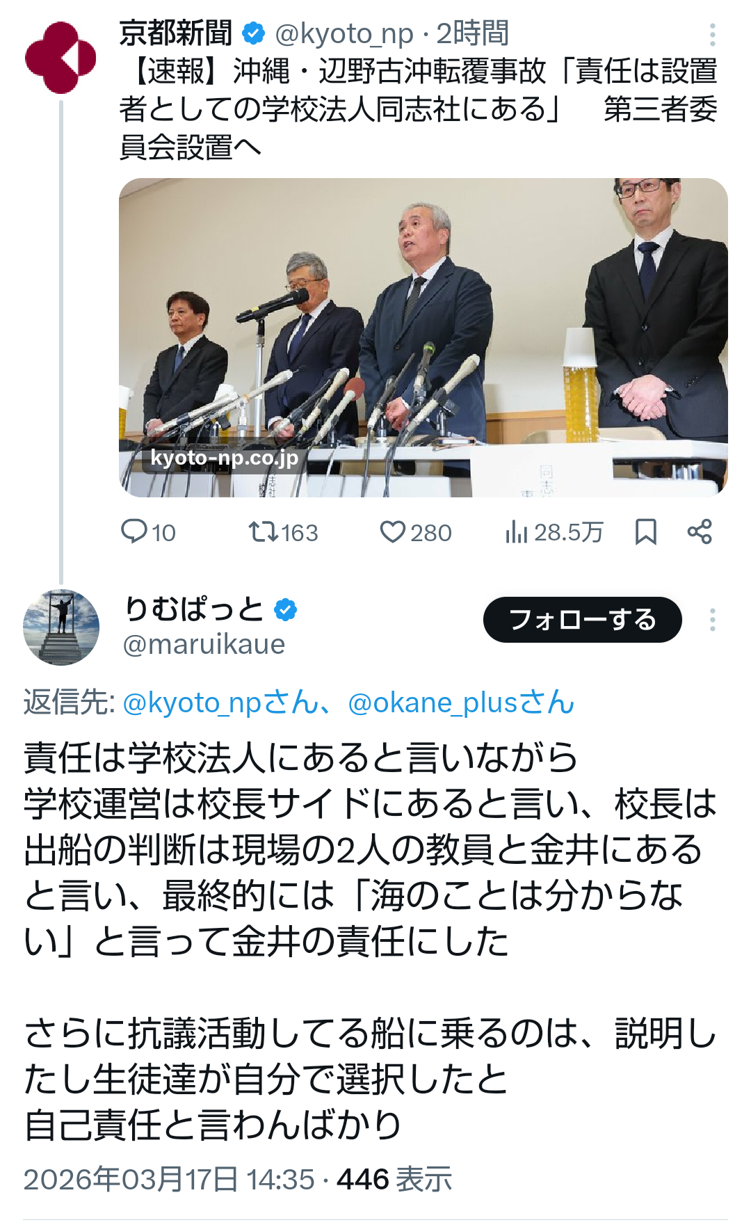 | … | 27無題Name名無し 26/03/17(火)15:05:20No.787606そうだねx2 1773727520491.png-(1636701 B) >骨折、打撲、大量の海水飲んだ生徒も 辺野古沖転覆 学校が陳謝 |