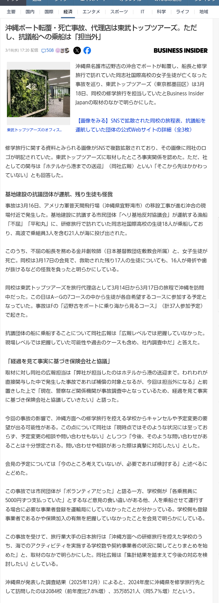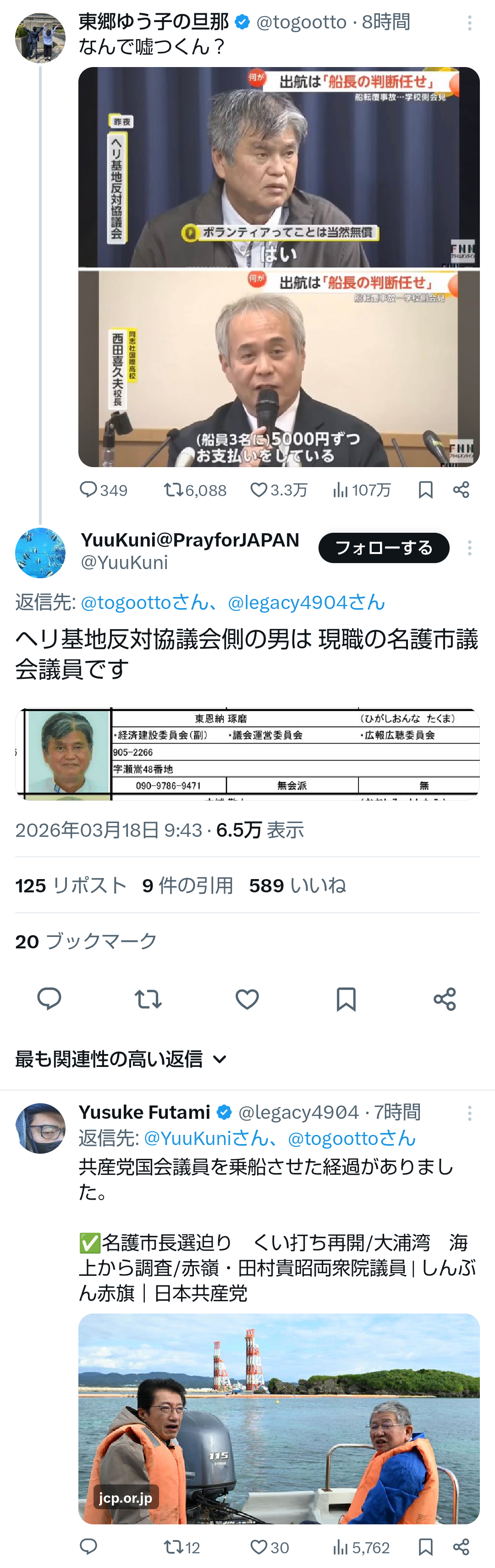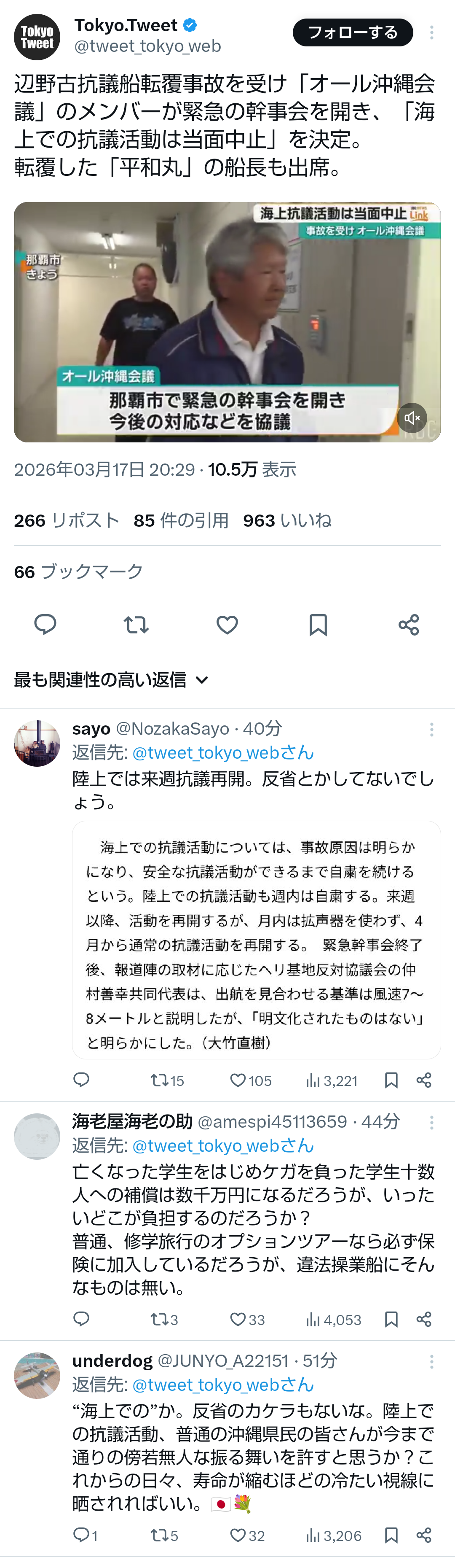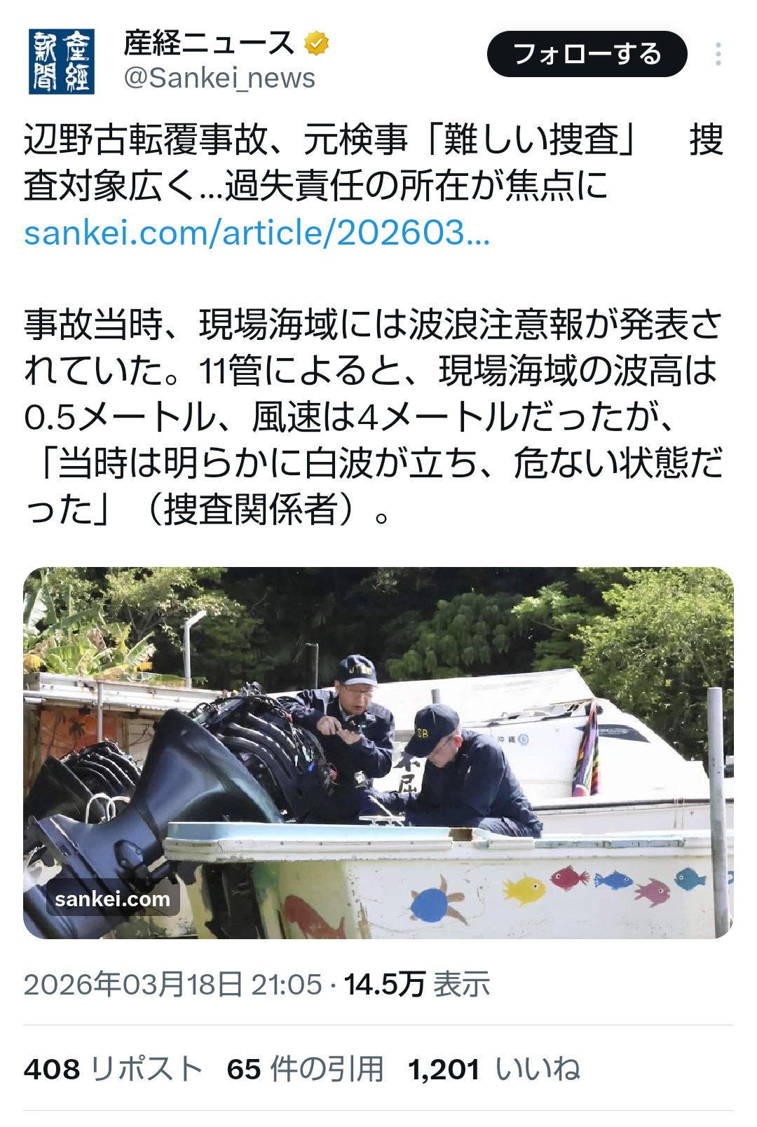 | … | 27無題Name名無し 26/03/17(火)15:05:20No.787606そうだねx2 1773727520491.png-(1636701 B) >骨折、打撲、大量の海水飲んだ生徒も 辺野古沖転覆 学校が陳謝 |
