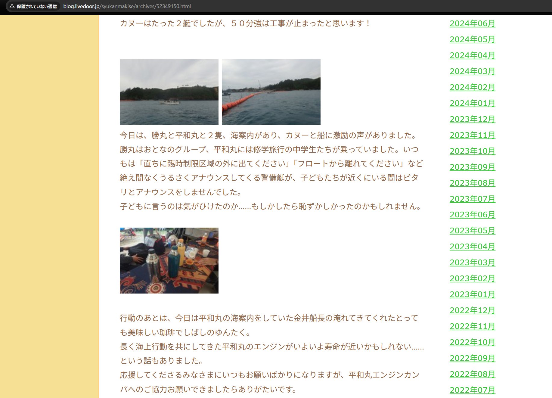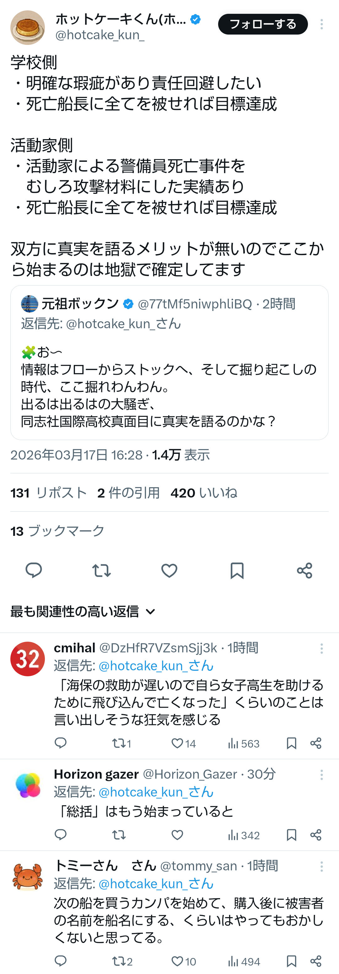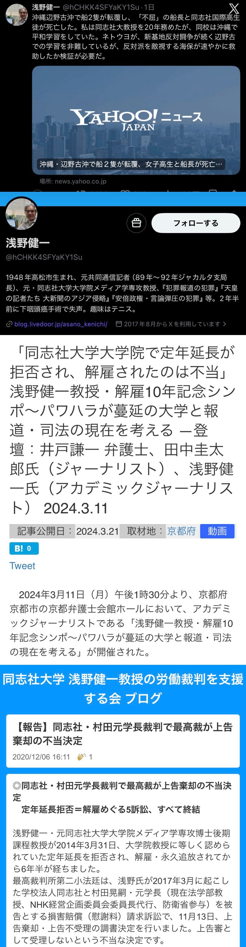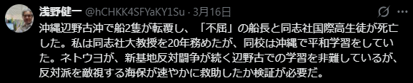 | … | 709無題Name名無し 26/03/20(金)19:03:20No.788420そうだねx1>>服部氏は、沖縄県名護市辺野古沖で同志社国際高の生徒ら2人が死亡した船転覆事故を挙げると、「安全対策を取らないといけない」と述べた上で、「こうした事故によって、平和学習に対するバッシングが来ないように、力を合わせて、この危機を乗り越えていきたいと心から念じている」と語った。 |