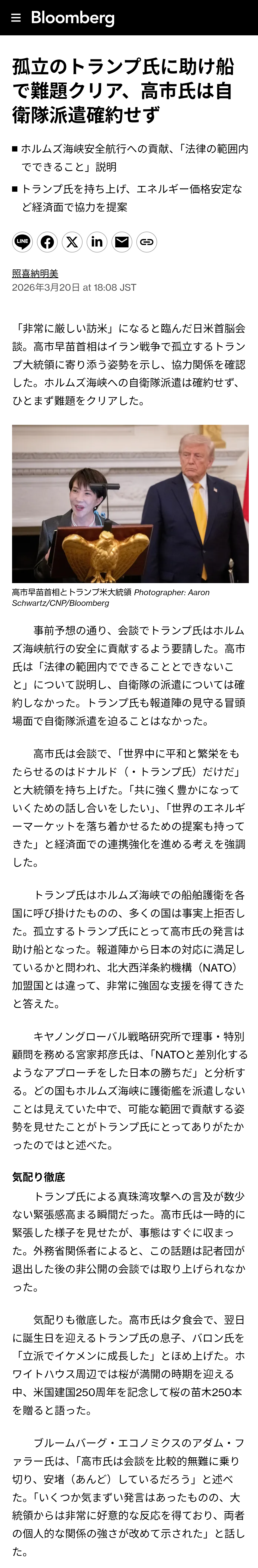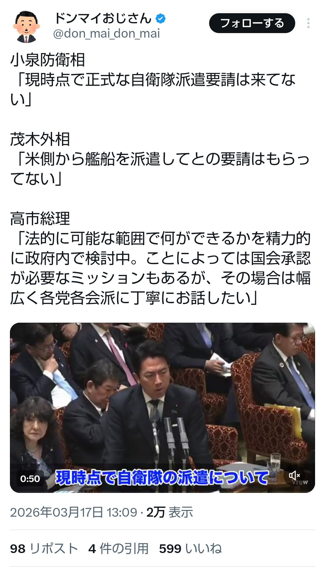 | … | 755無題Name名無し 26/03/20(金)23:47:20No.788469+ 1774018040591.png-(1631923 B) >孤立のトランプ氏に助け船で難題クリア、高市氏は自衛隊派遣確約せず |