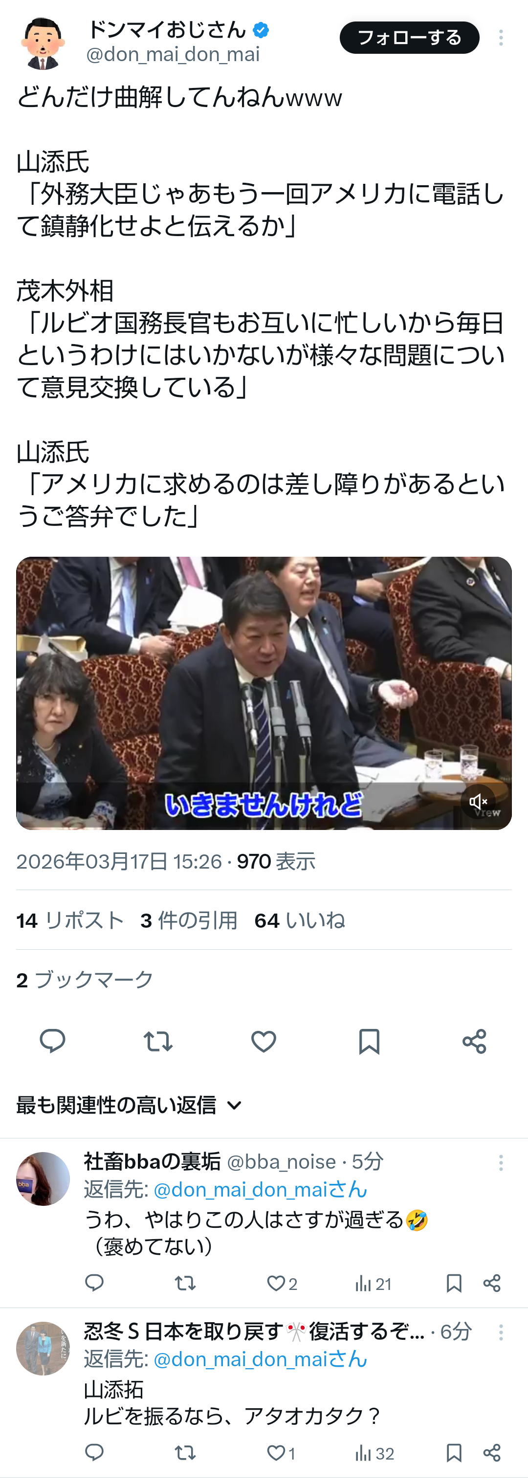 | … | 752無題Name名無し 26/03/20(金)23:35:26No.788466+>>茂木外務大臣「So so(まぁまぁだね)」 |