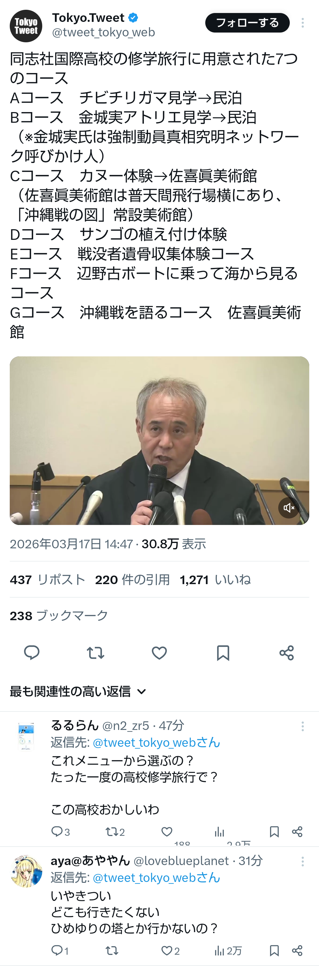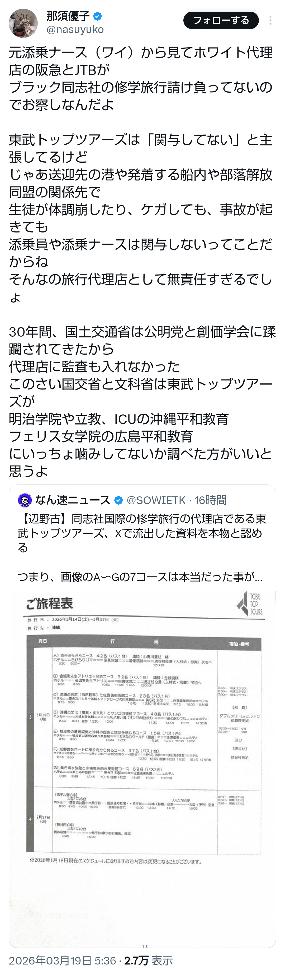 | … | 51無題Name名無し 26/03/17(火)16:34:06No.787638そうだねx8嫌だよなぁ・・・高い修学旅行積立金使って行く楽しい沖縄修学旅行がパヨク利権の食い物にされてるとか |