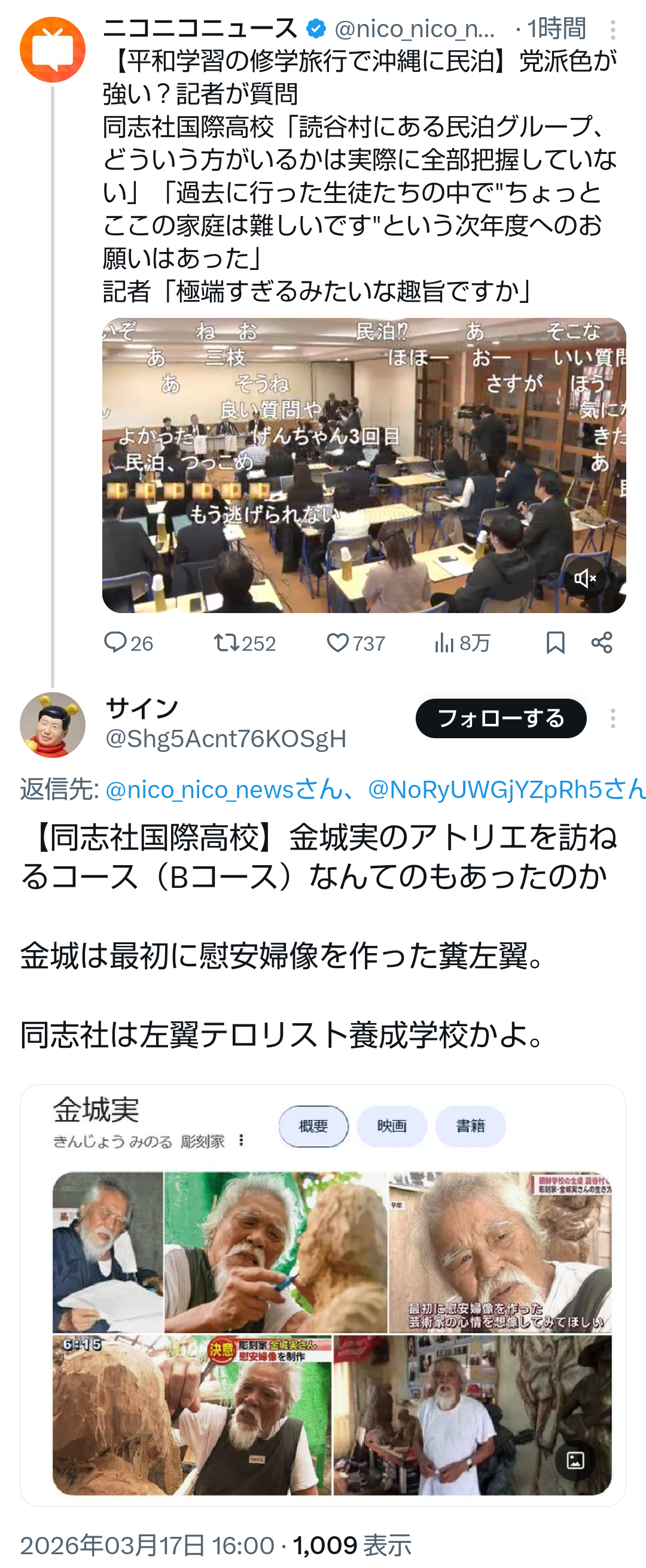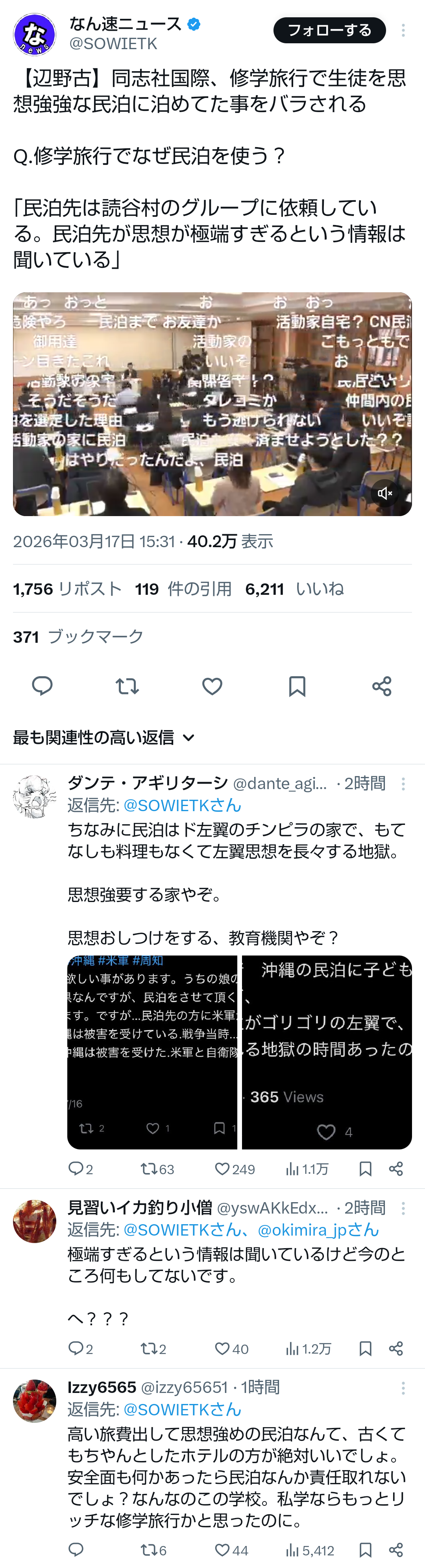 | … | 46無題Name名無し 26/03/17(火)16:25:28No.787633そうだねx3 1773732328389.png-(1848625 B) >【平和学習の修学旅行で沖縄に民泊】党派色が強い?記者が質問 |