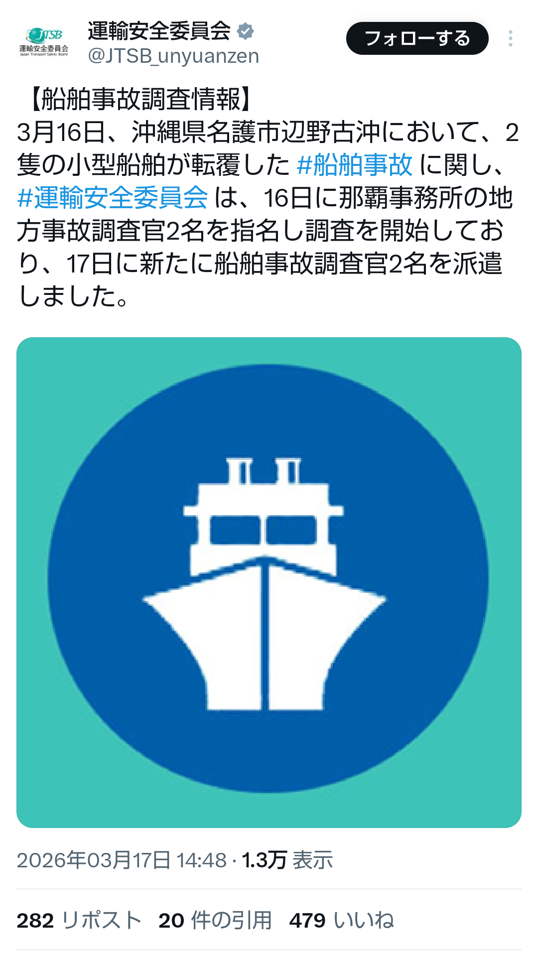 | … | 65無題Name名無し 26/03/17(火)17:11:46No.787653そうだねx7>【速報】辺野古沖事故、運輸安全委が調査官派遣 |