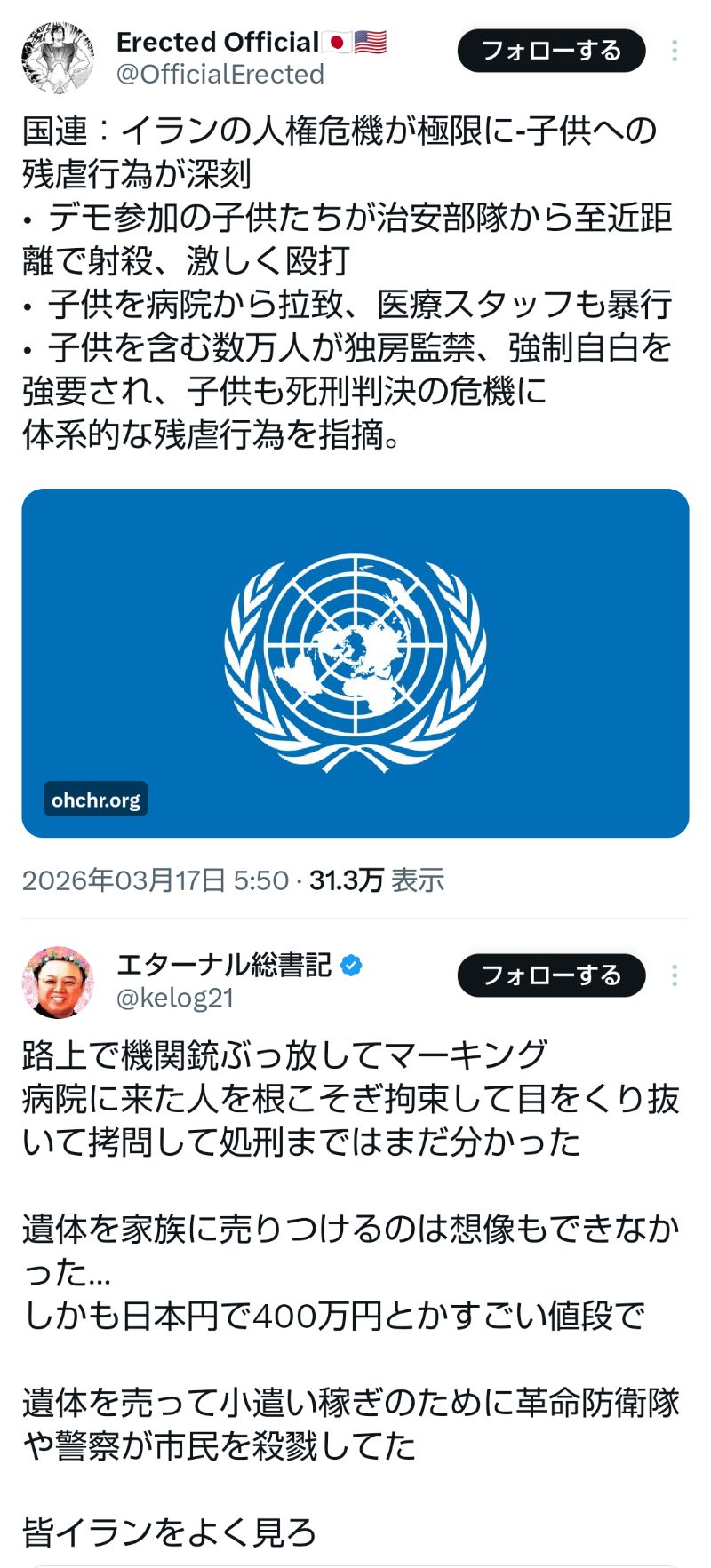 | … | 94無題Name名無し 26/03/17(火)18:56:30No.787693そうだねx5 1773741390150.jpg-(209509 B) https://www.ohchr.org/en/press-releases/2026/03/un-expert-warns-deepening-human-rights-crisis-iran |