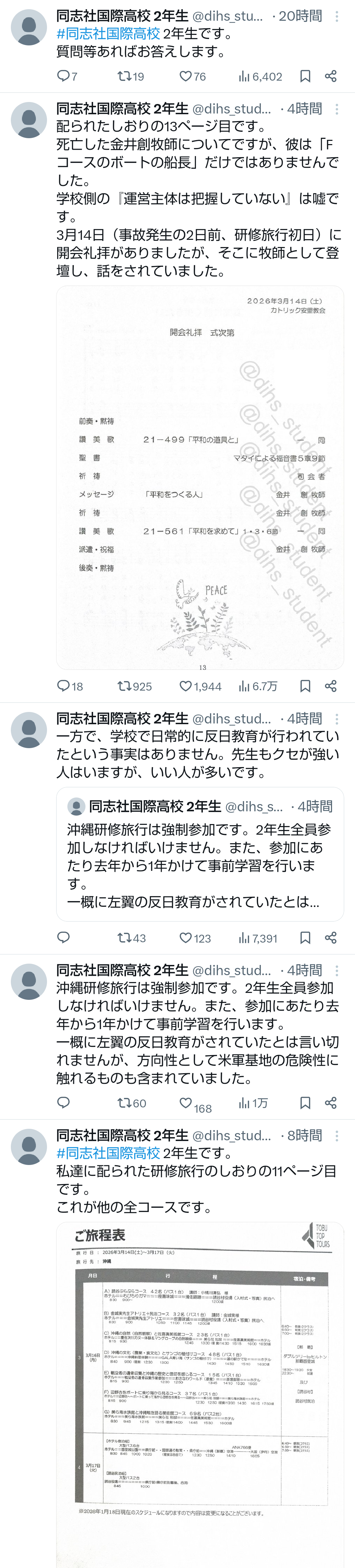 | … | 97無題Name名無し 26/03/17(火)19:01:41No.787696+ 1773741701270.png-(1094947 B) >【船転覆事故】同志社国際高校の「平和学習」の実態 「半強制的に…」「泣き出す生徒もいた」 |