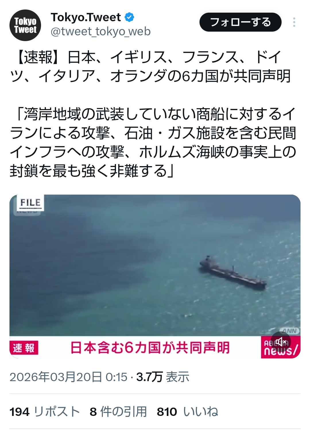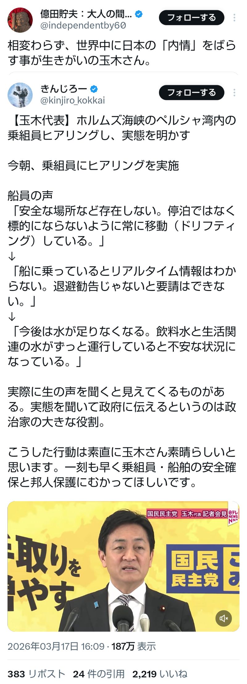 | … | 39無題Name名無し 26/03/17(火)15:58:07No.787626そうだねx8まず左の連中には原油の供給路がどうなってるかが見えてないようだから話をするステージにいないと言い換えられる |
