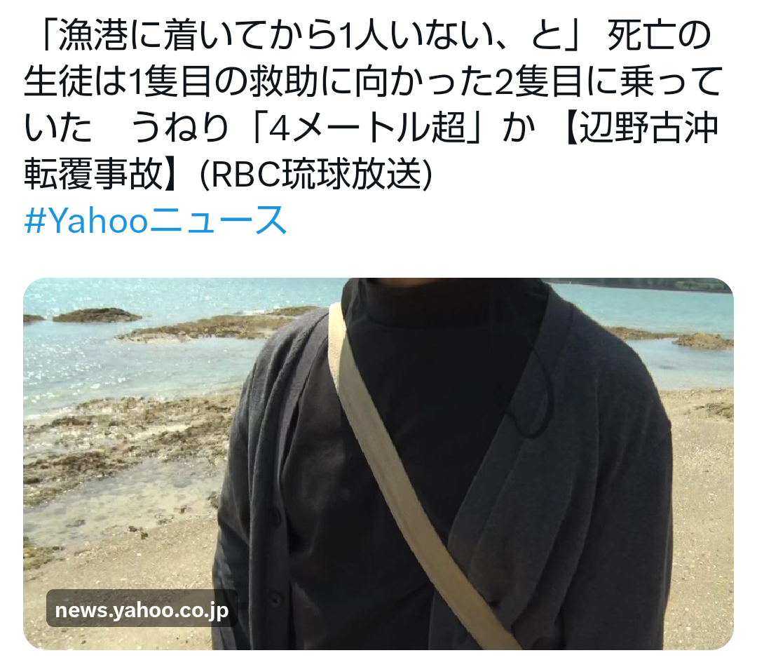 | … | 10無題Name名無し 26/03/17(火)14:05:00No.787581+亡くなったJKはライフジャケット着けた状態で転覆した |