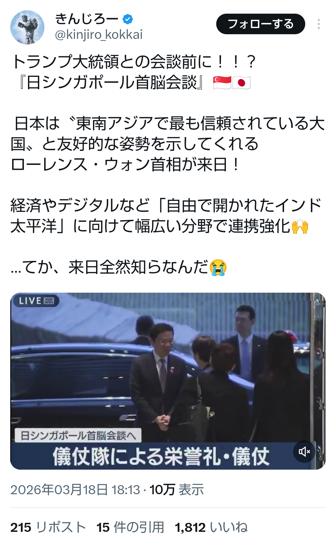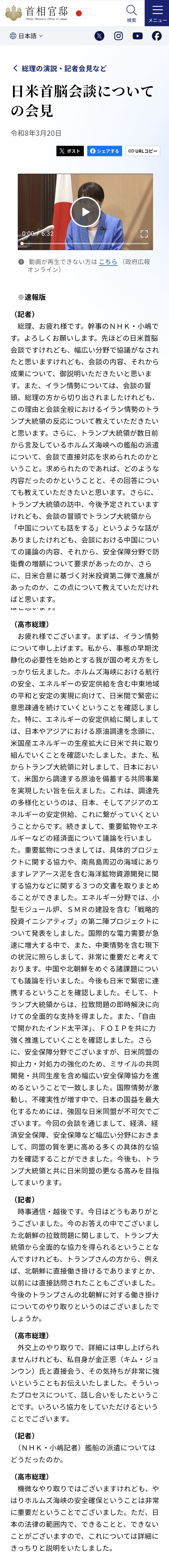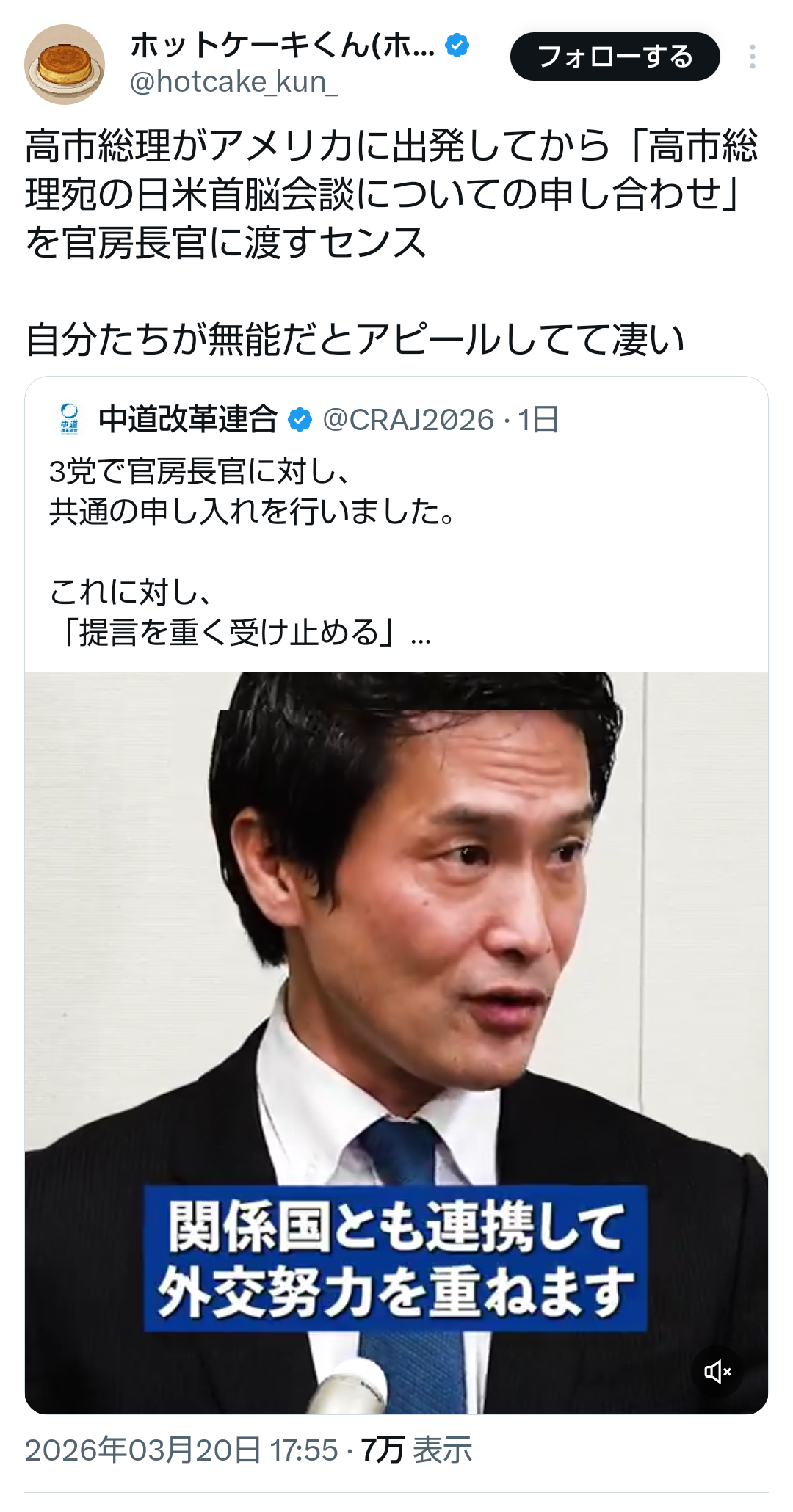 | … | 727無題Name名無し 26/03/20(金)21:25:14No.788440+今回の会談、野党が事前に散々「絶対される!」「絶対受け入れる!」って騒いだイラン関係の戦時派遣サクッと回避したから褒めるしかできないはずなんだが |