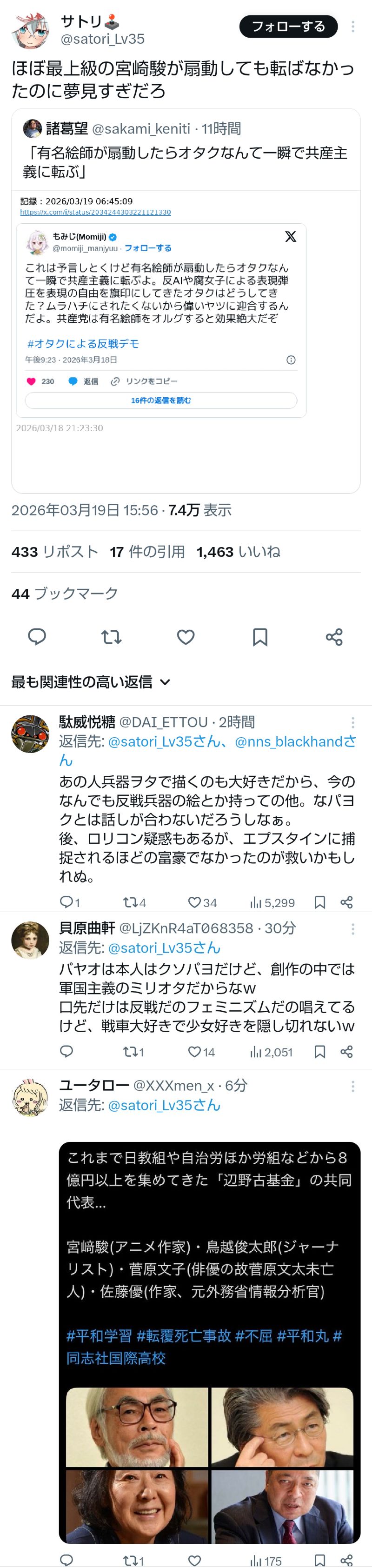 | … | 88無題Name名無し 26/03/17(火)18:36:41No.787687そうだねx3コメント出したら日本中の左翼から誹謗中傷されるからなぁ |