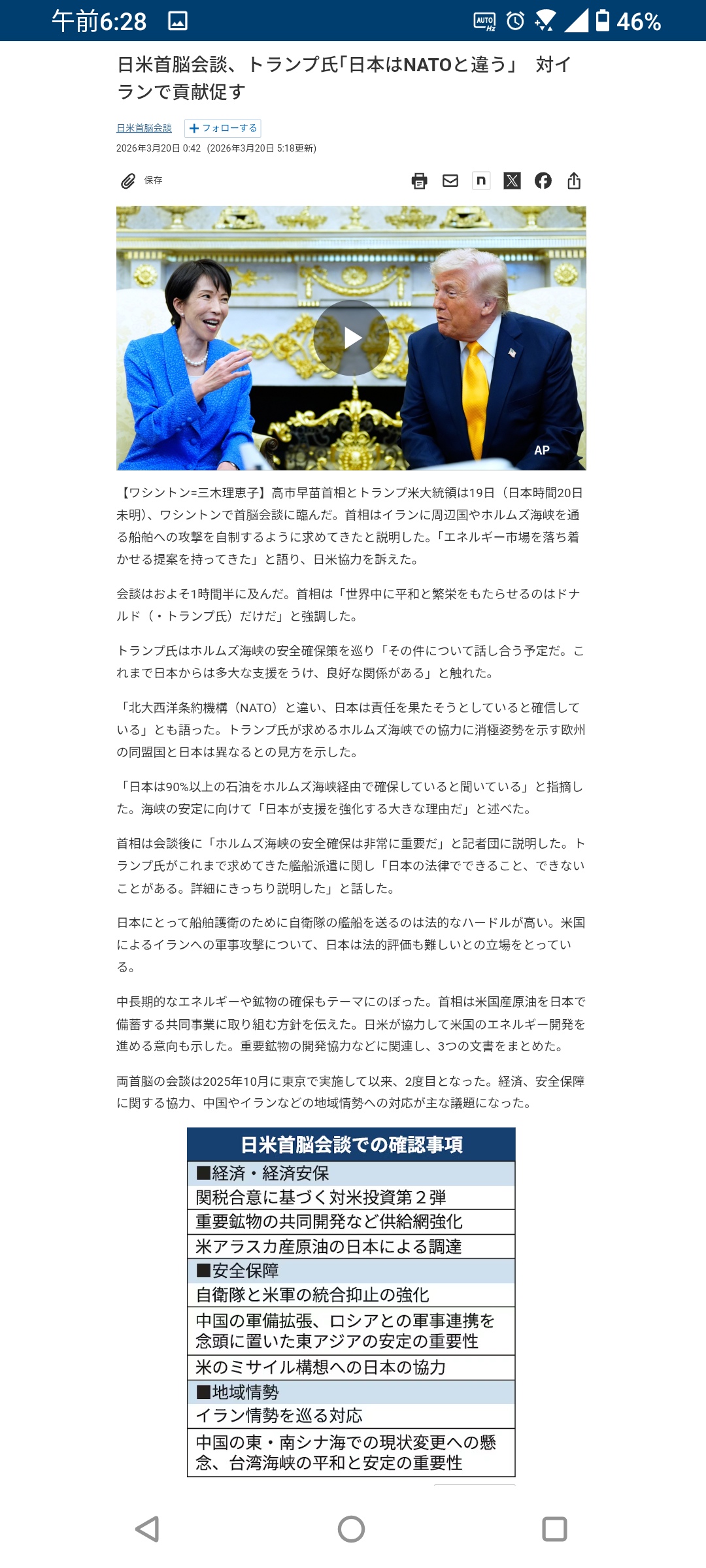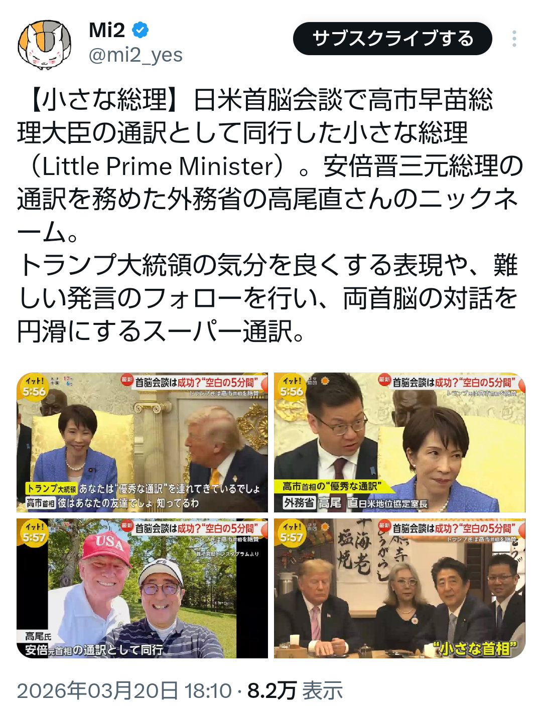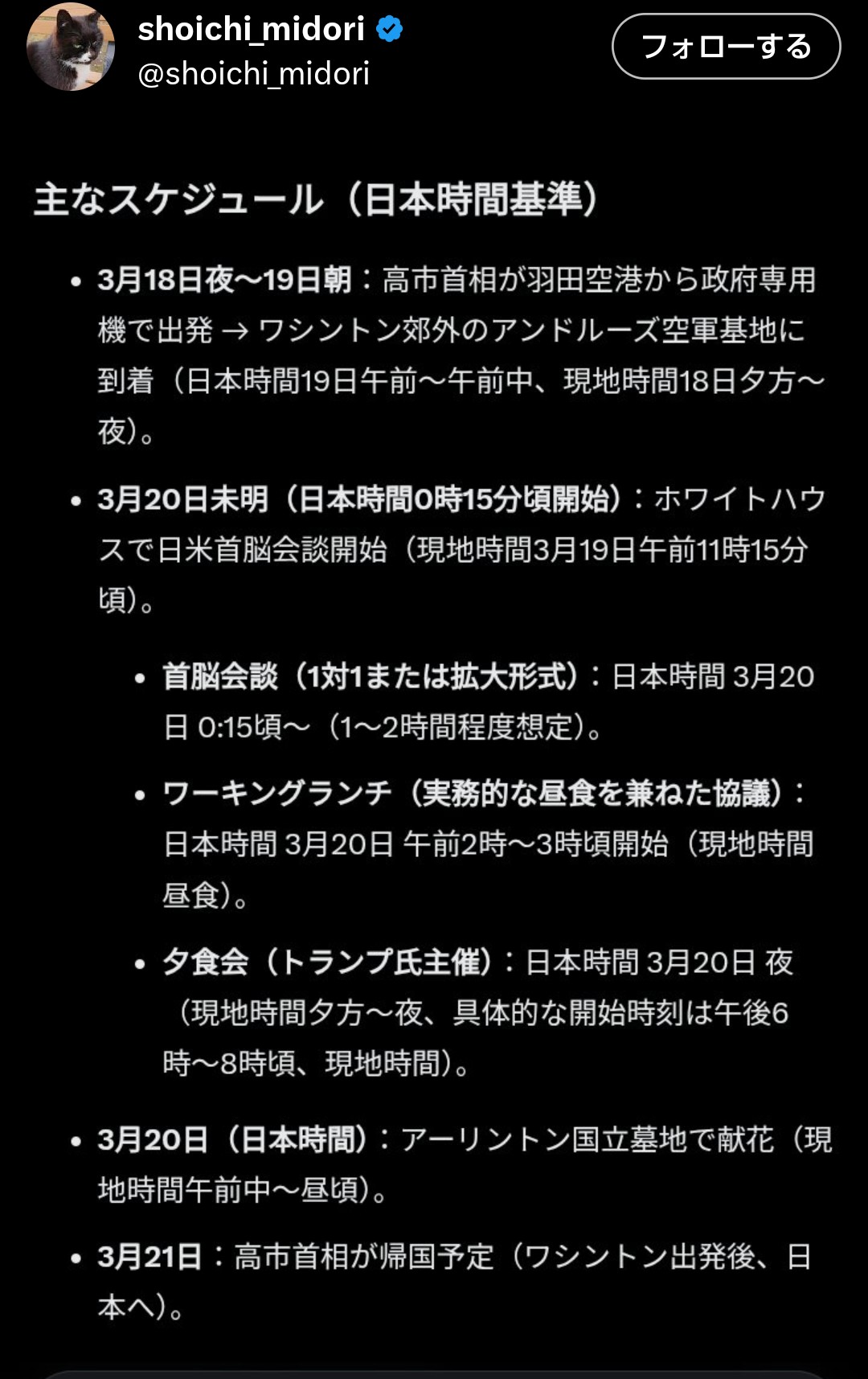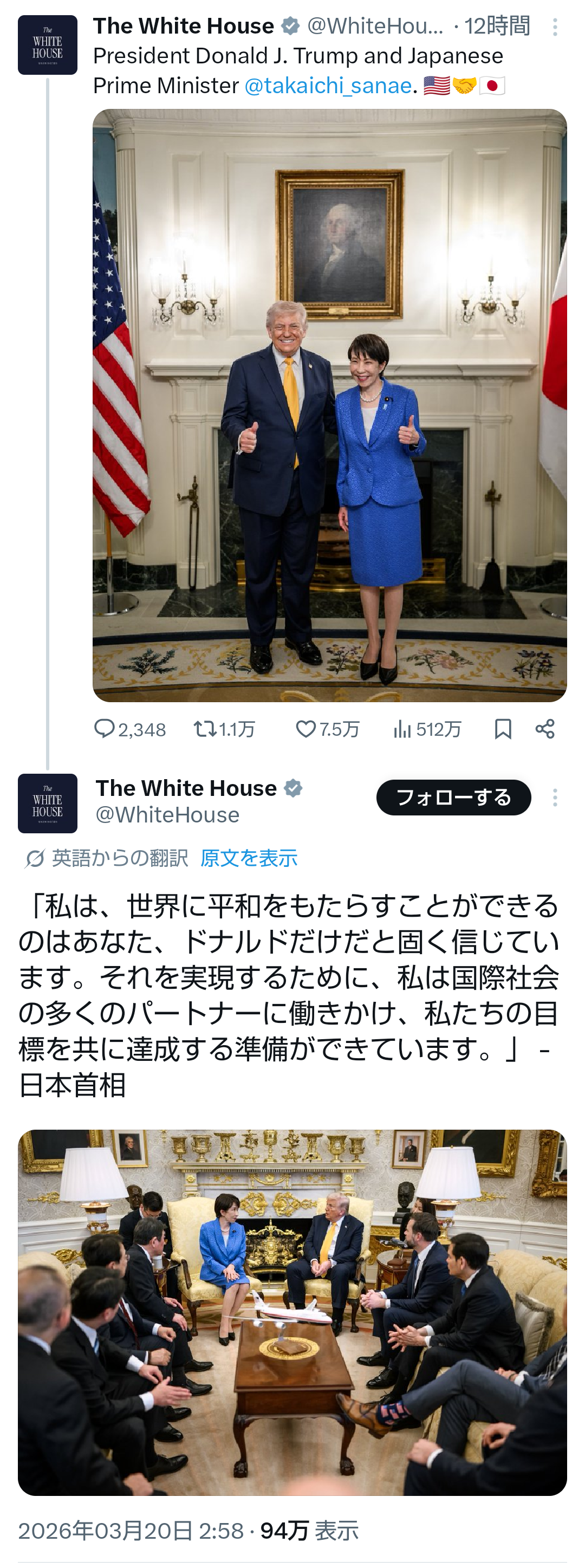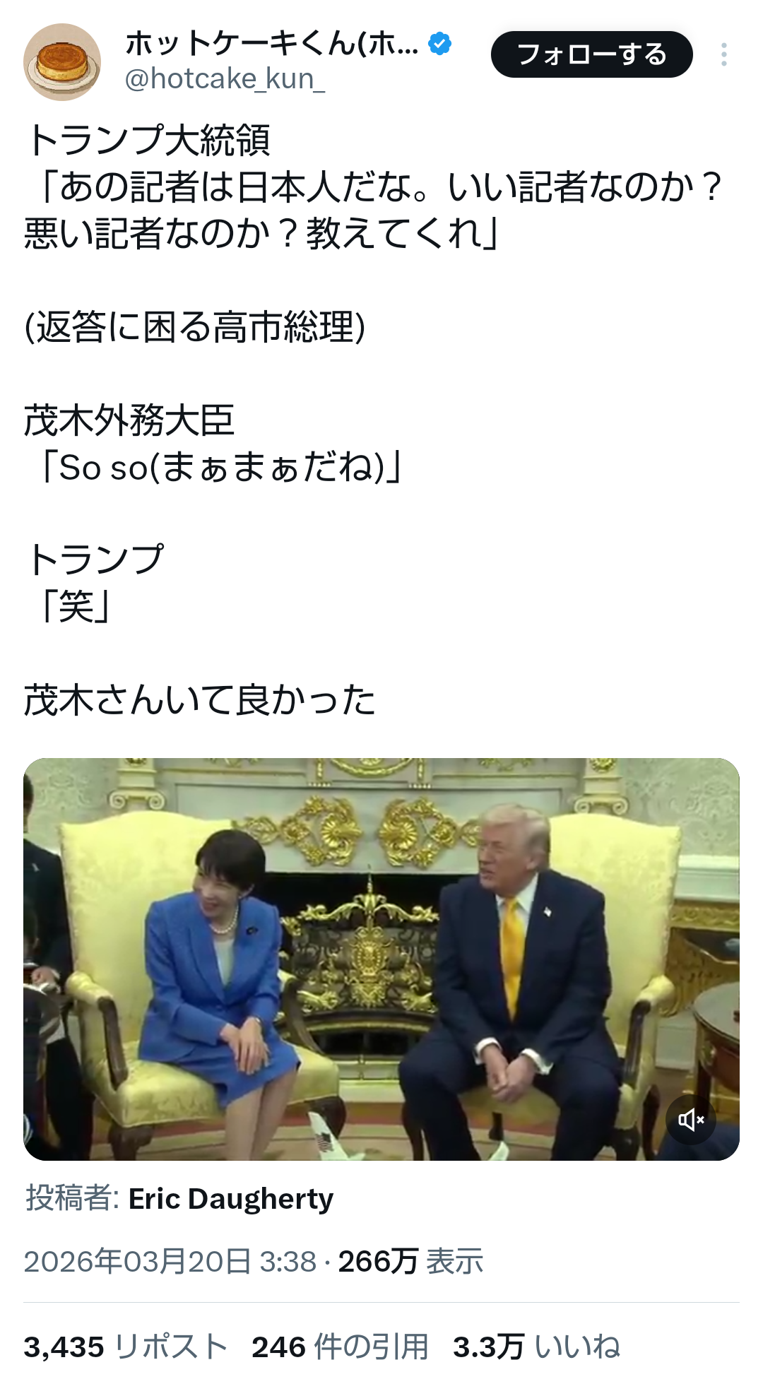 | … | 743無題Name名無し 26/03/20(金)23:08:10No.788457+ 1774015690943.png-(756322 B) >日米首脳会談、米メディア「高市首相、ほぼ無傷で乗り切った」 |