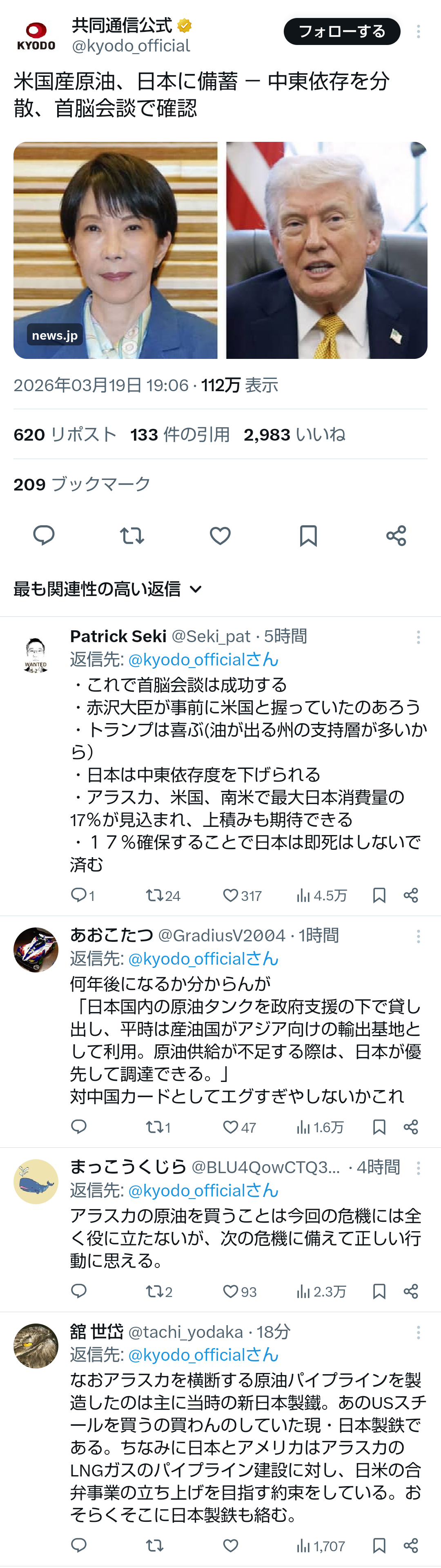 | … | 96無題Name名無し 26/03/17(火)19:00:26No.787695そうだねx4高市首相、米国産原油輸入拡大を伝達意向 トランプ氏に首脳会談で |