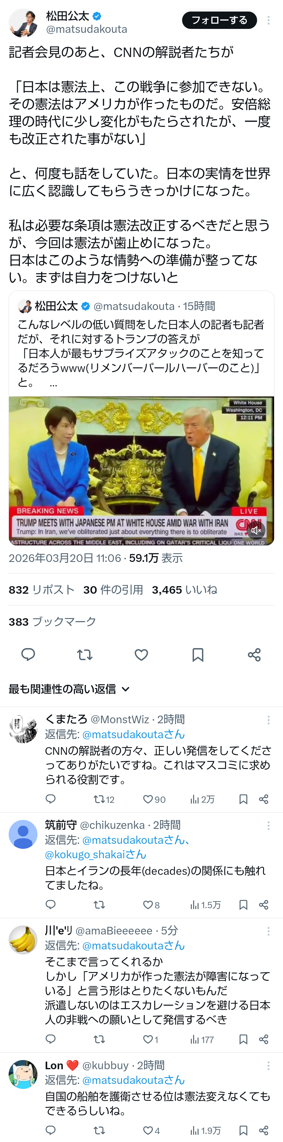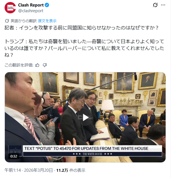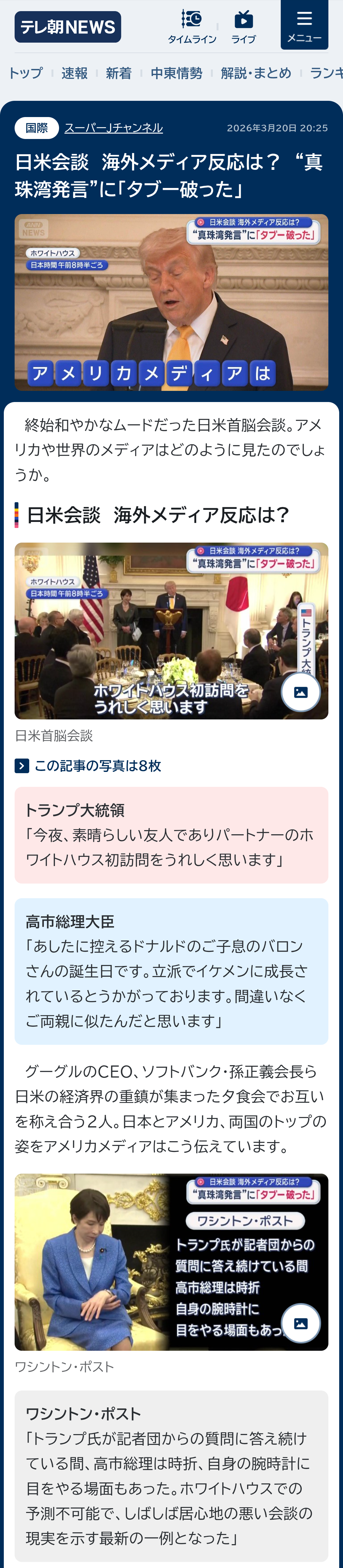 | … | 733無題Name名無し 26/03/20(金)22:34:52No.788447+ 1774013692910.png-(2859391 B) >日米会談 海外メディア反応は? “真珠湾発言”に「タブー破った」 |