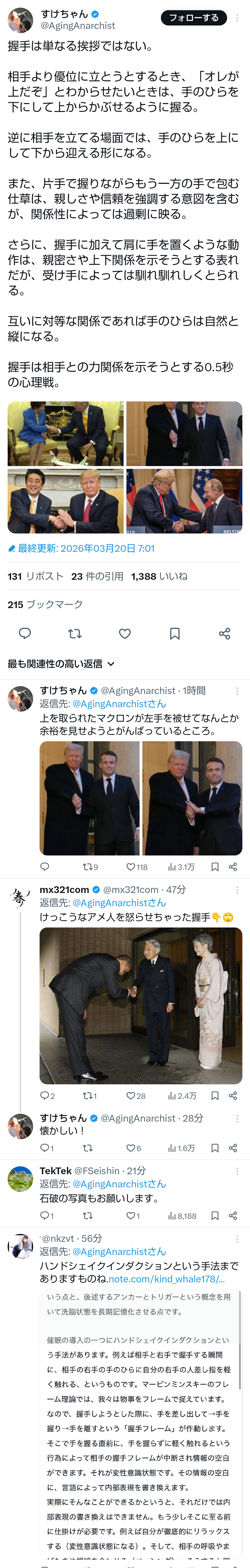 | … | 687無題Name名無し 26/03/20(金)17:05:04No.788398そうだねx3「幇間外交」をバカにするなかれ |