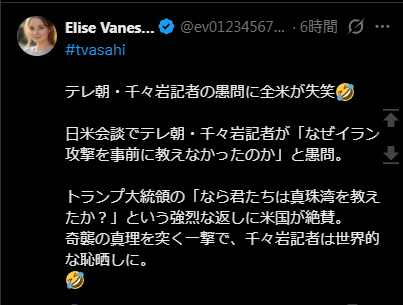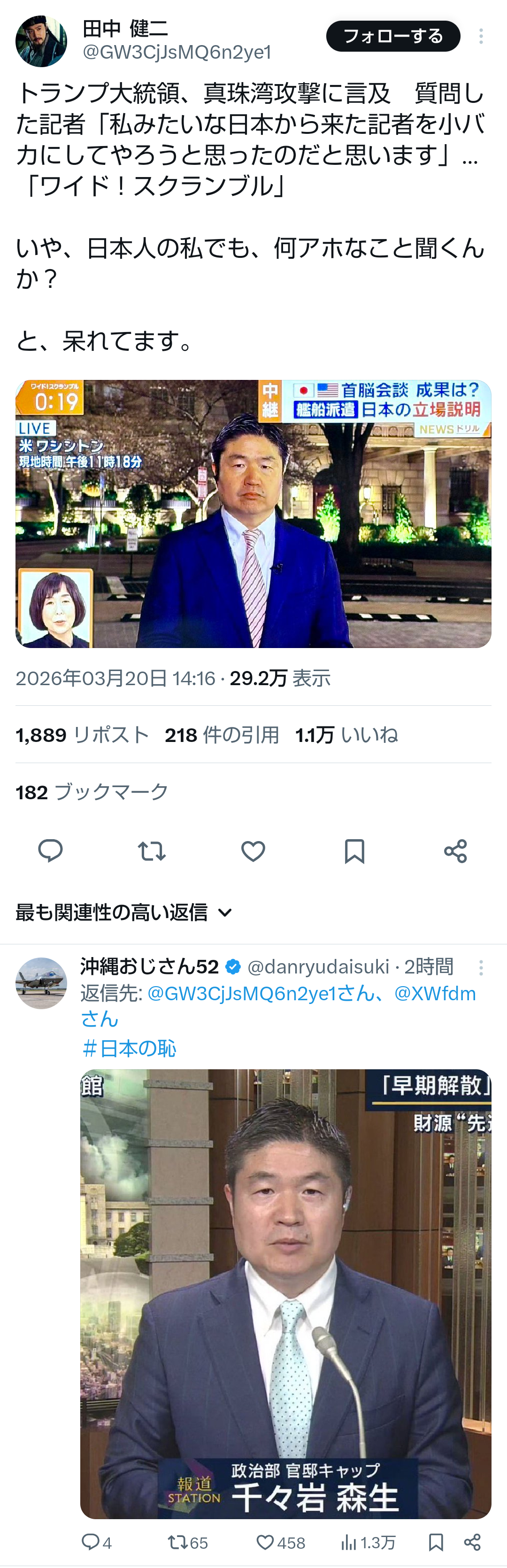 | … | 706無題Name名無し 26/03/20(金)18:29:02No.788417+ 1773998942056.png-(807836 B) >【高市訪米】日テレ記者、テレ朝千々岩記者を腐してて草 |
