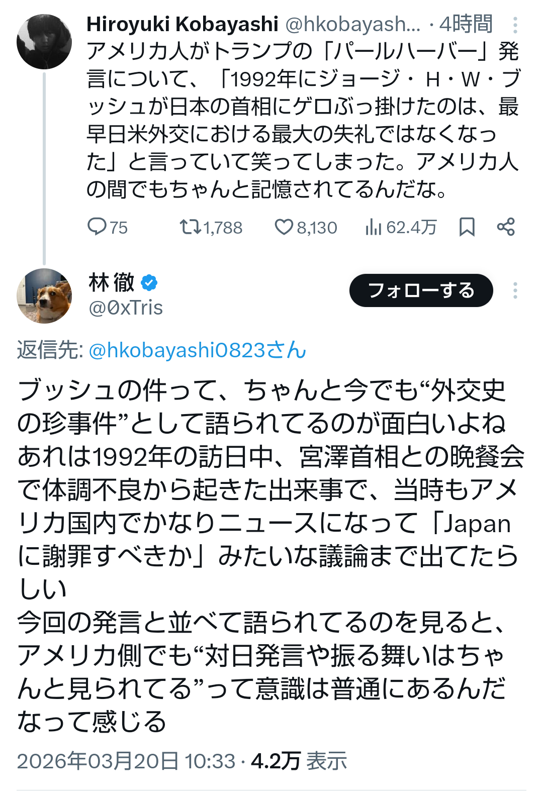 | … | 740無題Name名無し 26/03/20(金)22:59:53No.788454+世界は「おいおい日本の首相がそばに居るのに『パールハーバー』って言ったらヤバいだろ」 |