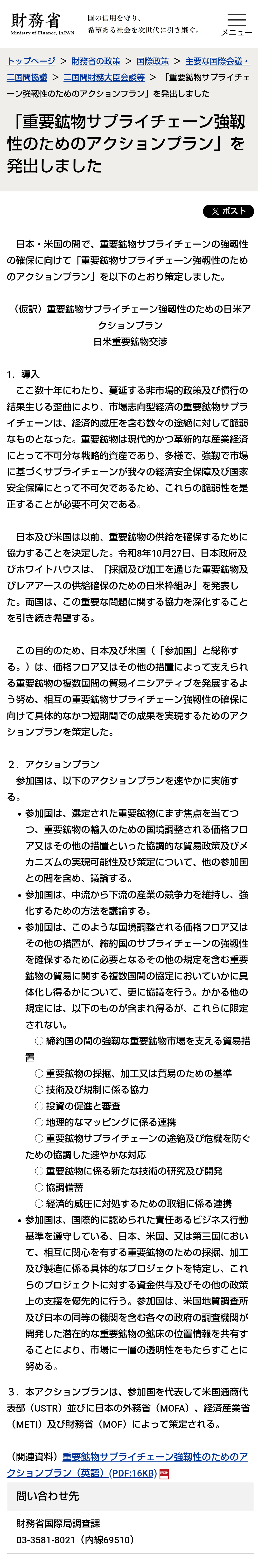 | … | 667無題Name名無し 26/03/20(金)14:19:36No.788378そうだねx2 1773983976308.png-(1408772 B) >「重要鉱物サプライチェーン強靱性のためのアクションプラン」を発出しました |