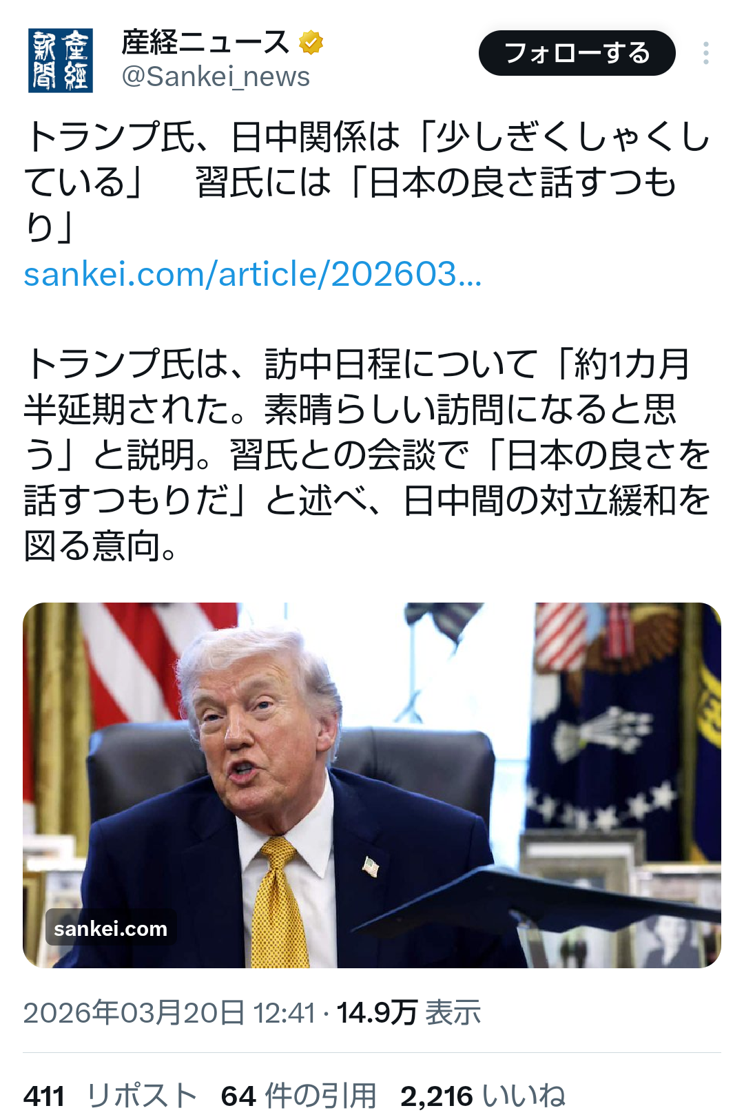 | … | 685無題Name名無し 26/03/20(金)16:52:50No.788396+ 1773993170422.png-(738636 B) >トランプ氏、日中関係は「少しぎくしゃくしている」 習氏には「日本の良さ話すつもり」 |