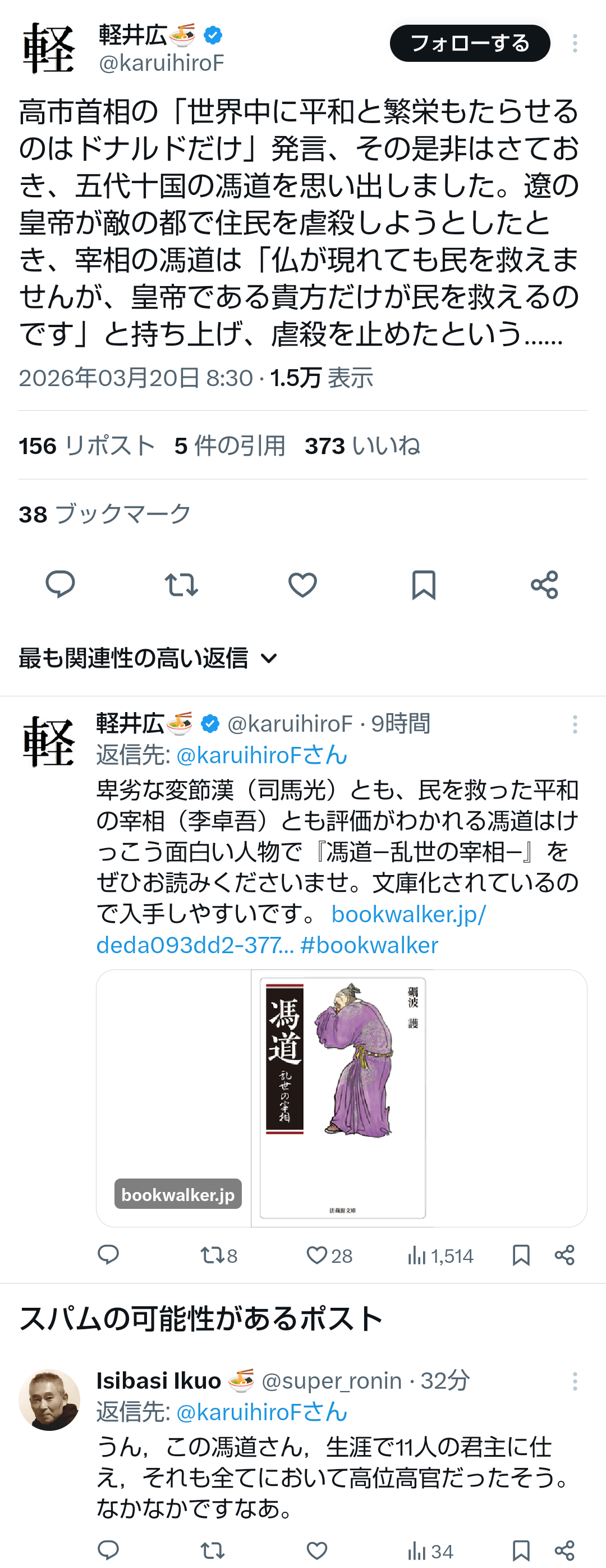 | … | 700無題Name名無し 26/03/20(金)17:54:00No.788411そうだねx1 1773996840793.png-(616752 B) >高市首相の「世界中に平和と繁栄もたらせるのはドナルドだけ」発言、その是非はさておき、五代十国の馮道を思い出しました。遼の皇帝が敵の都で住民を虐殺しようとしたとき、宰相の馮道は「仏が現れても民を救えませんが、皇帝である貴方だけが民を救えるのです」と持ち上げ、虐殺を止めたという |