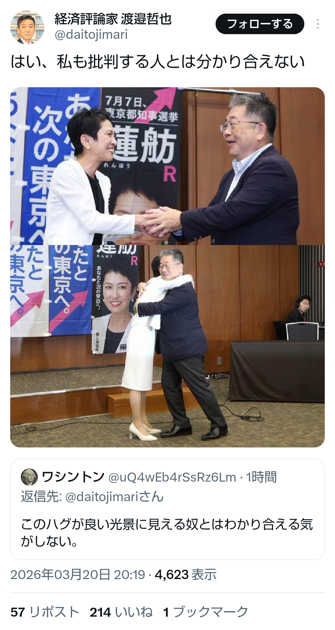 | … | 749無題Name名無し 26/03/20(金)23:24:21No.788463そうだねx2>榛葉さんめっちゃ褒めてんな日米首脳会談 |