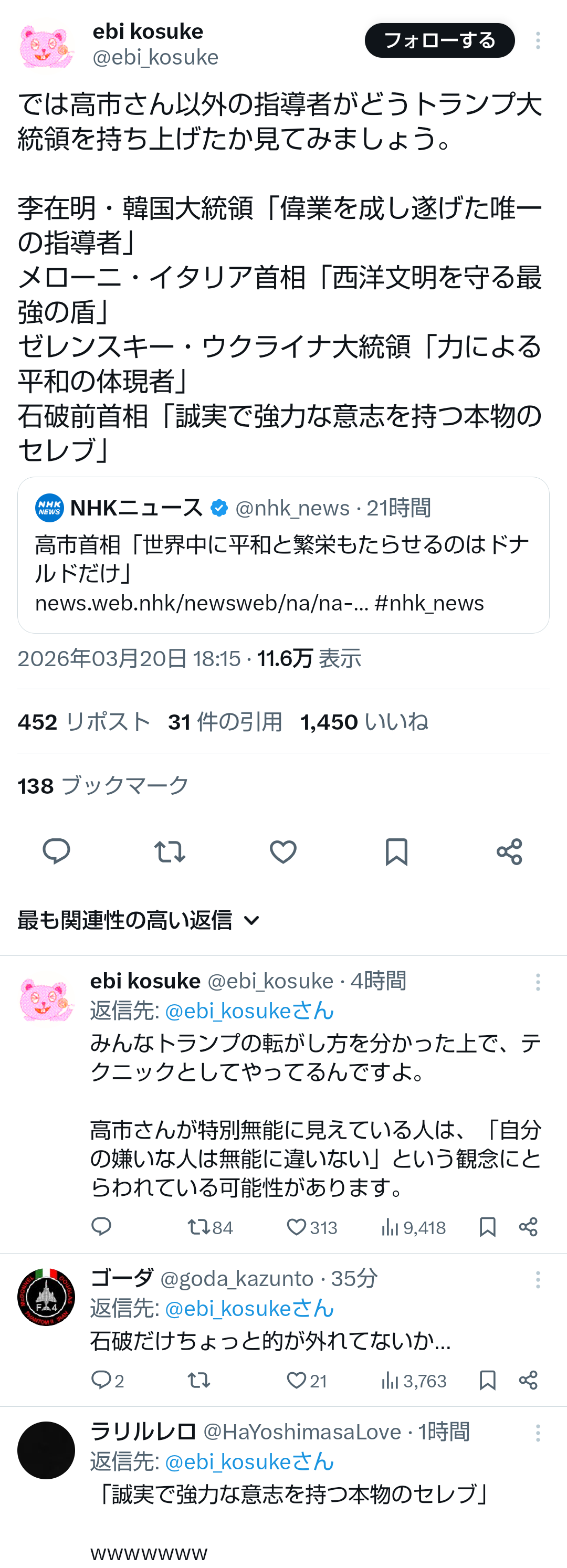 | … | 735無題Name名無し 26/03/20(金)22:48:03No.788449+ 1774014483462.png-(588256 B) >では高市さん以外の指導者がどうトランプ大統領を持ち上げたか見てみましょう。 |