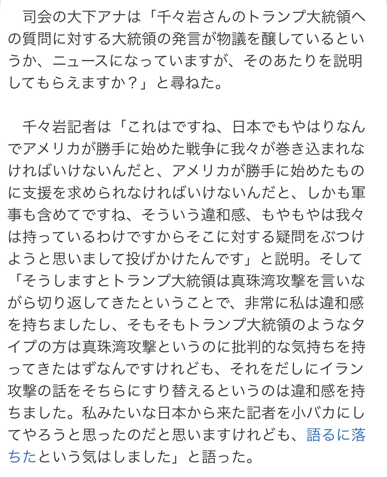 | … | 711無題Name名無し 26/03/20(金)19:10:05No.788422そうだねx1>>「イラン先制攻撃の質問、トランプを逆撫でするような事なのに」 |