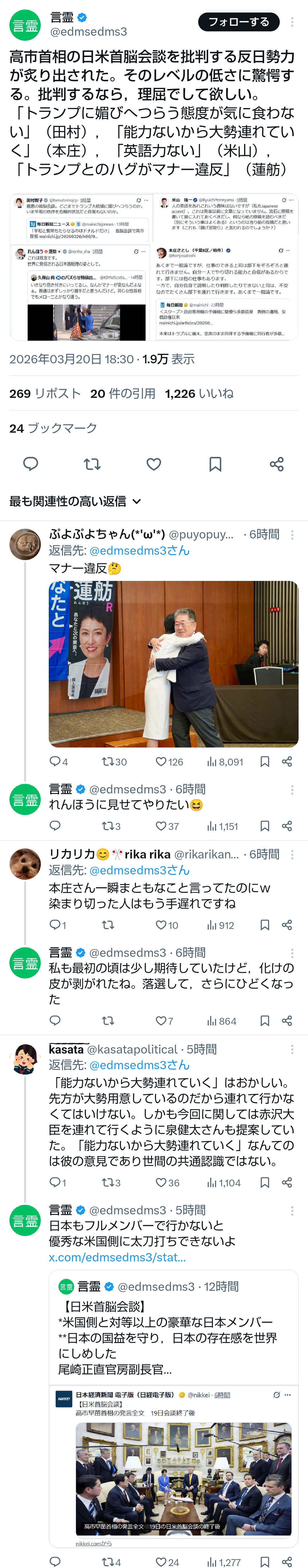 | … | 763無題Name名無し 26/03/21(土)01:43:40No.788477+ 1774025020099.png-(2439895 B) >高市首相の日米首脳会談を批判する反日勢力が炙り出された。そのレベルの低さに驚愕する。批判するなら,理屈でして欲しい。 |