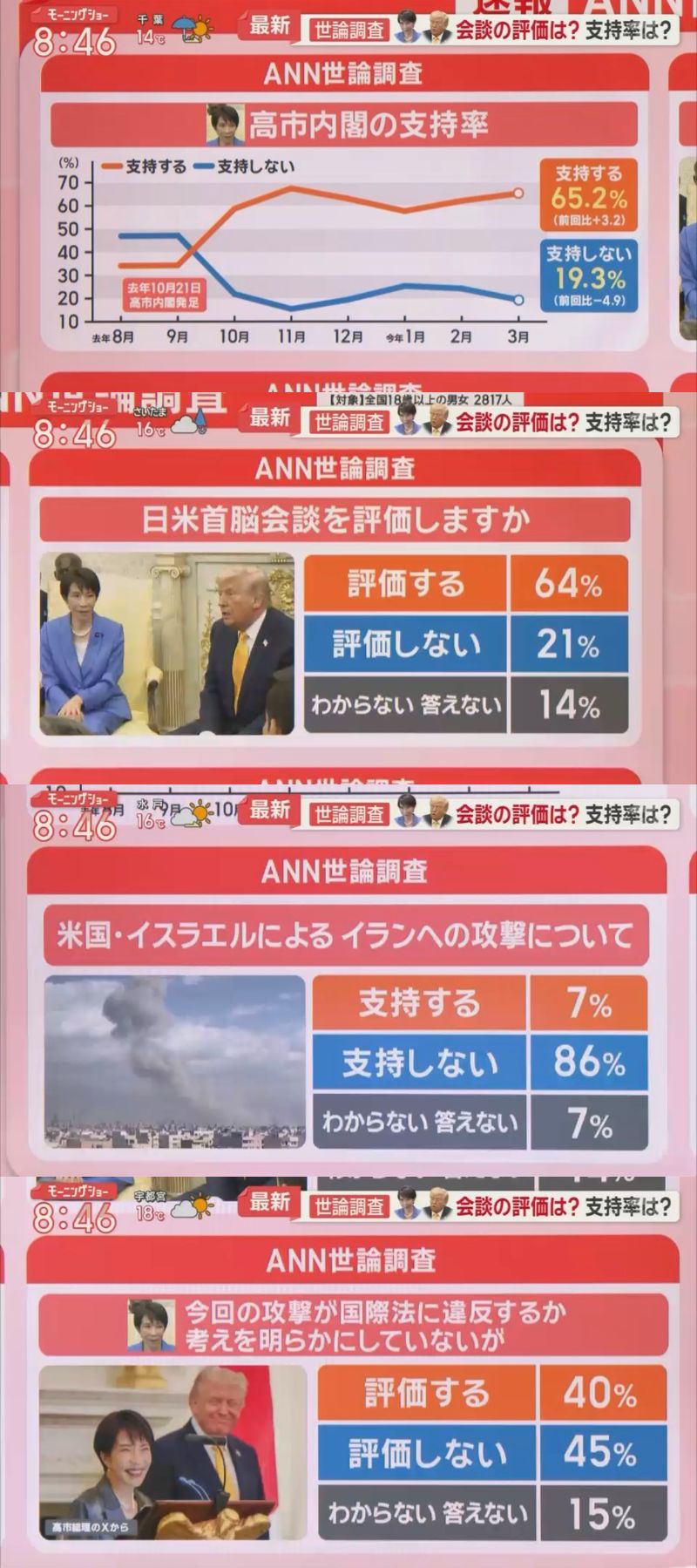 | … | 32無題Name名無し 26/03/23(月)13:09:40No.788822+ 1774238980651.jpg-(214641 B) >ANN世論調査。高市早苗内閣支持率は先月より3.2ポイント上昇し、65.2%、支持しないは19.3%。 |