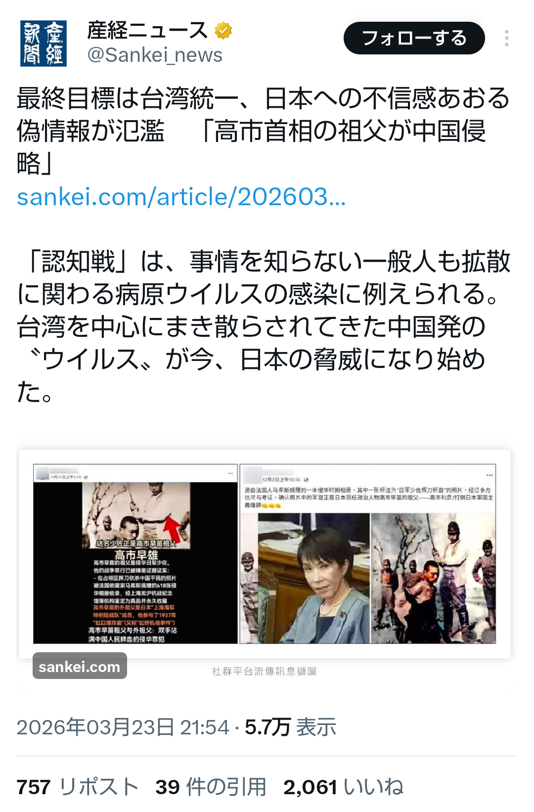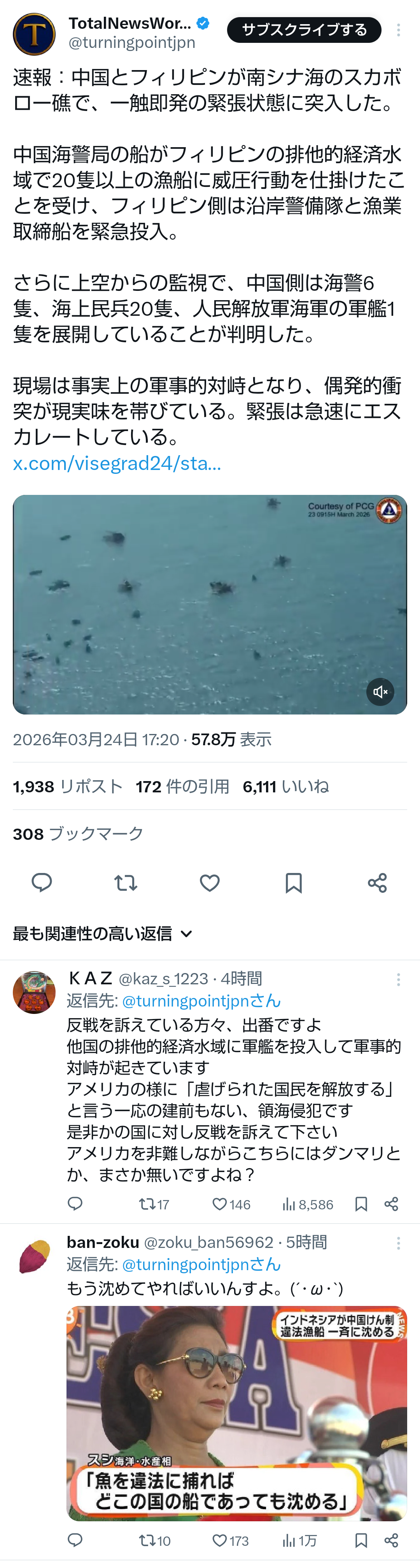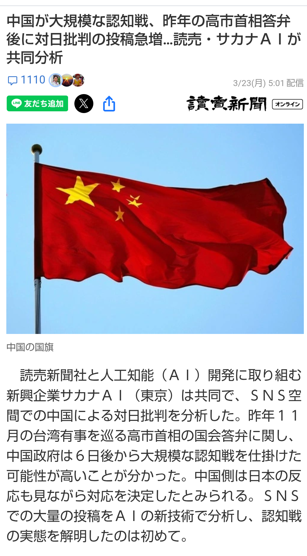 | … | 35無題Name名無し 26/03/23(月)13:24:18No.788825そうだねx2 1774239858256.png-(767995 B) >中国が大規模な認知戦、昨年の高市首相答弁後に対日批判の投稿急増…読売・サカナAIが共同分析 |