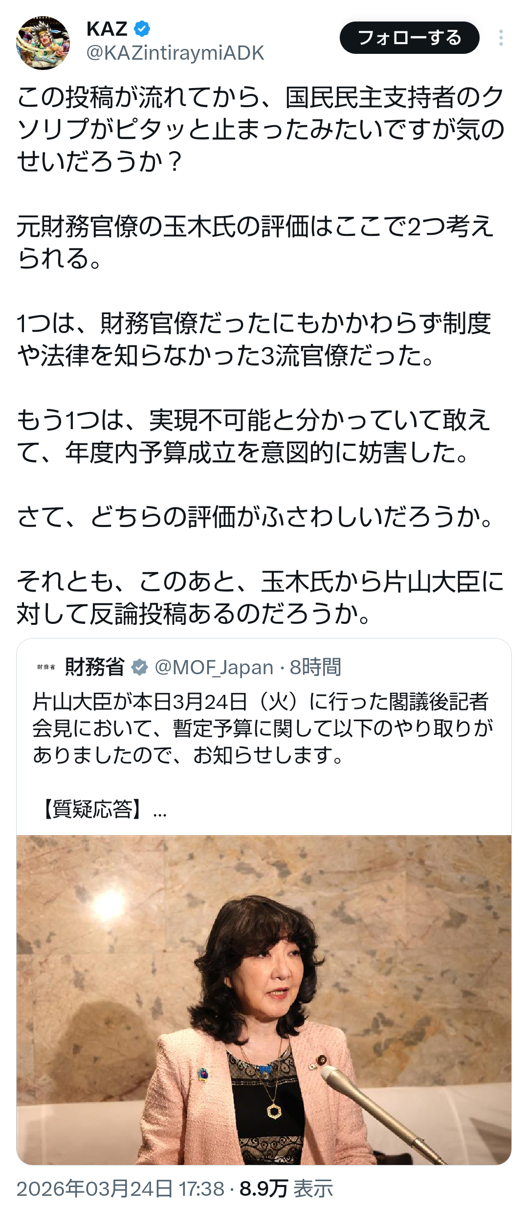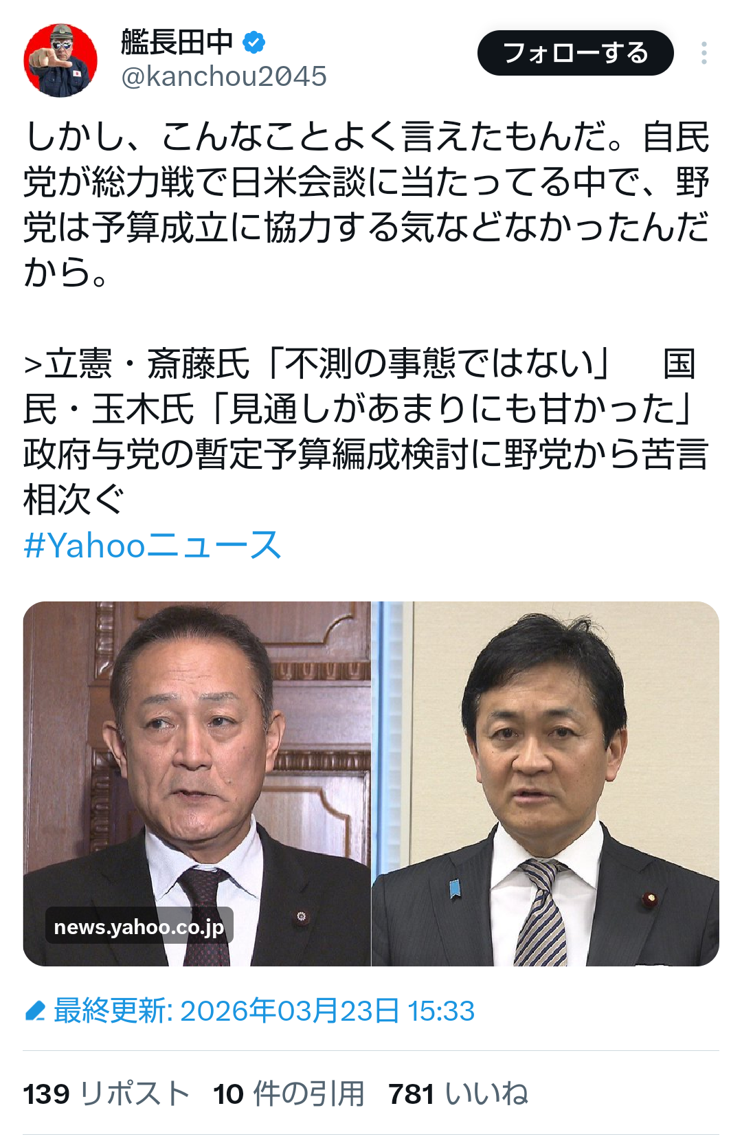 | … | 87無題Name名無し 26/03/23(月)19:19:55No.788889+例え何があろうと予算審議に抵抗する大前提だからこそ不測の事態じゃないってわけだな |