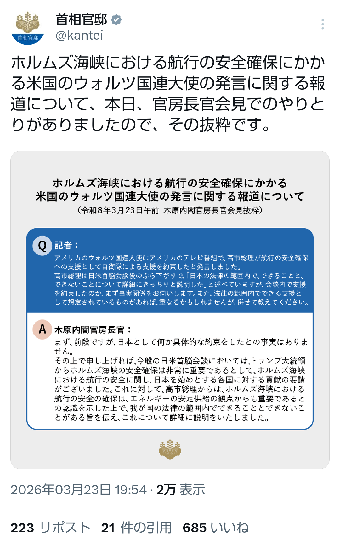 | … | 94無題Name名無し 26/03/23(月)20:23:35No.788900そうだねx3 1774265015733.png-(508591 B) >ホルムズ海峡における航行の安全確保にかかる米国のウォルツ国連大使の発言に関する報道について、本日、官房長官会見でのやりとりがありましたので、その抜粋です。 |