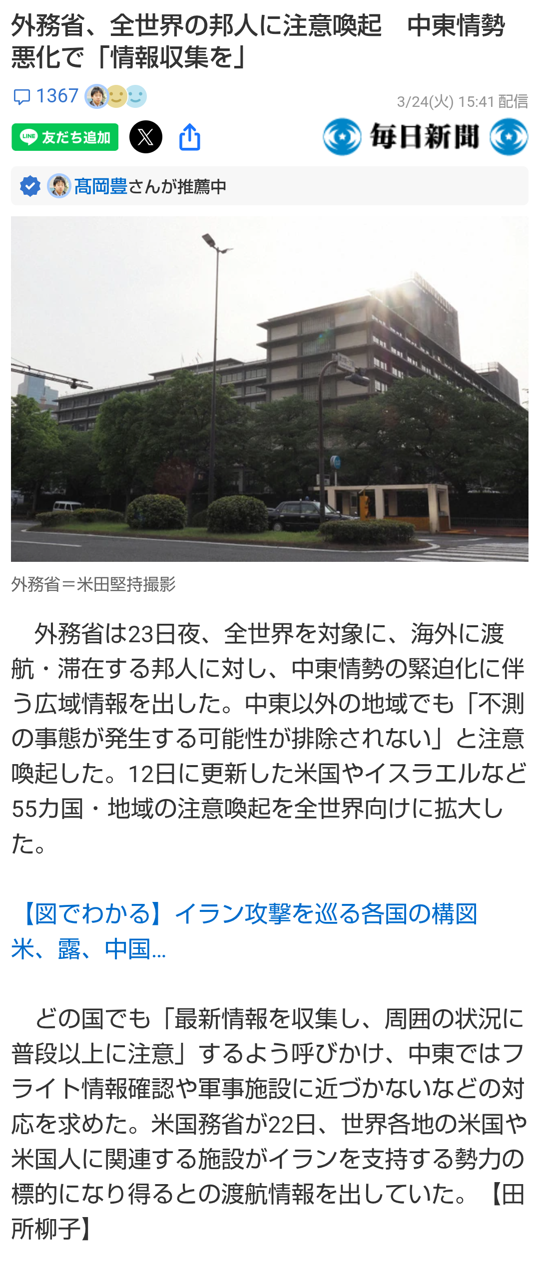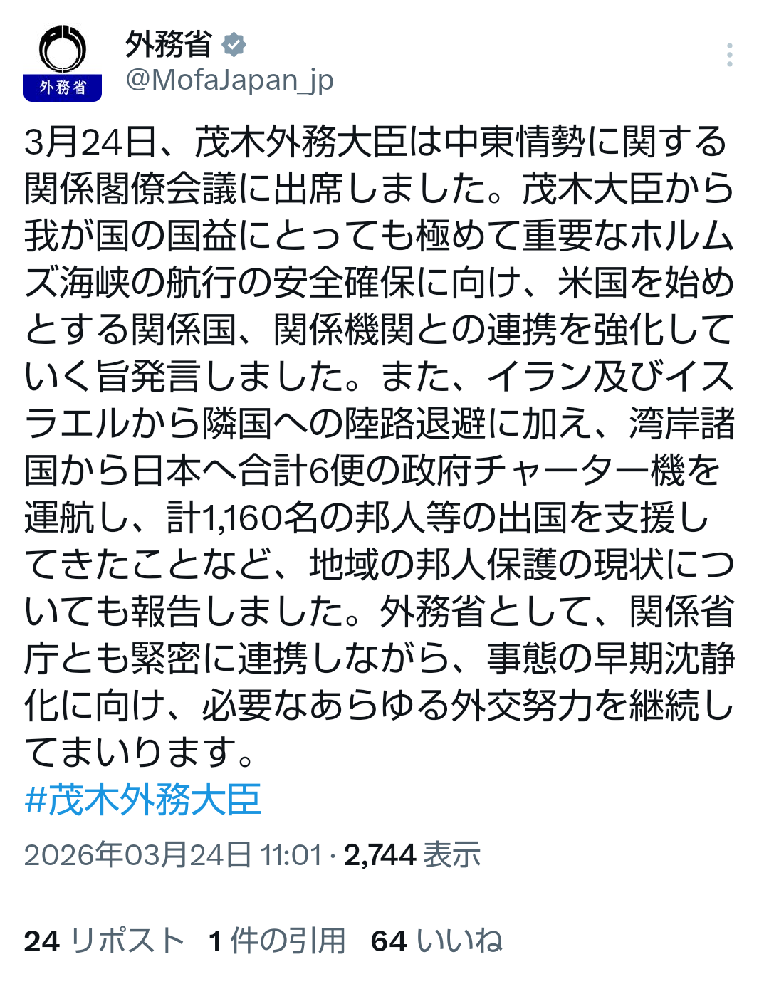 | … | 260無題Name名無し 26/03/24(火)23:49:51No.789098そうだねx1 1774363791018.png-(1071137 B) >外務省、全世界の邦人に注意喚起 中東情勢悪化で「情報収集を」 |
