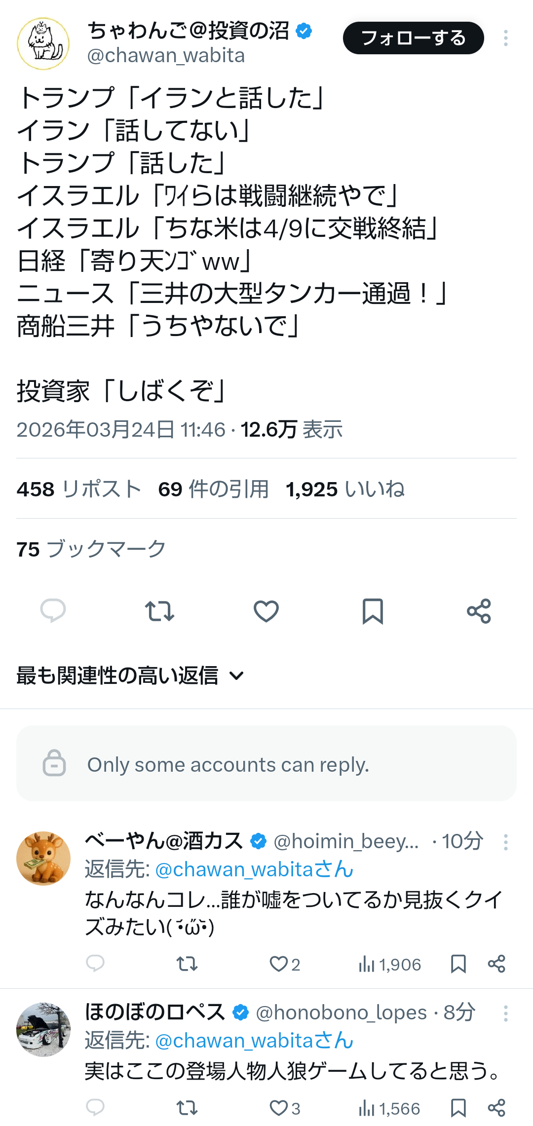 | … | 343無題Name名無し 26/03/25(水)14:09:56No.789195+>しかしこれトランプへの返信てことは革命防衛軍ではなくイラン政府側からの要求か? |