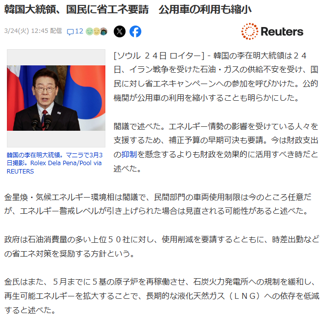 | … | 13無題Name名無し 26/03/23(月)12:23:17No.788801そうだねx1>韓国国内で保管中の国際共同備蓄原油、イラン戦争後90万バレルを海外に販売していた |