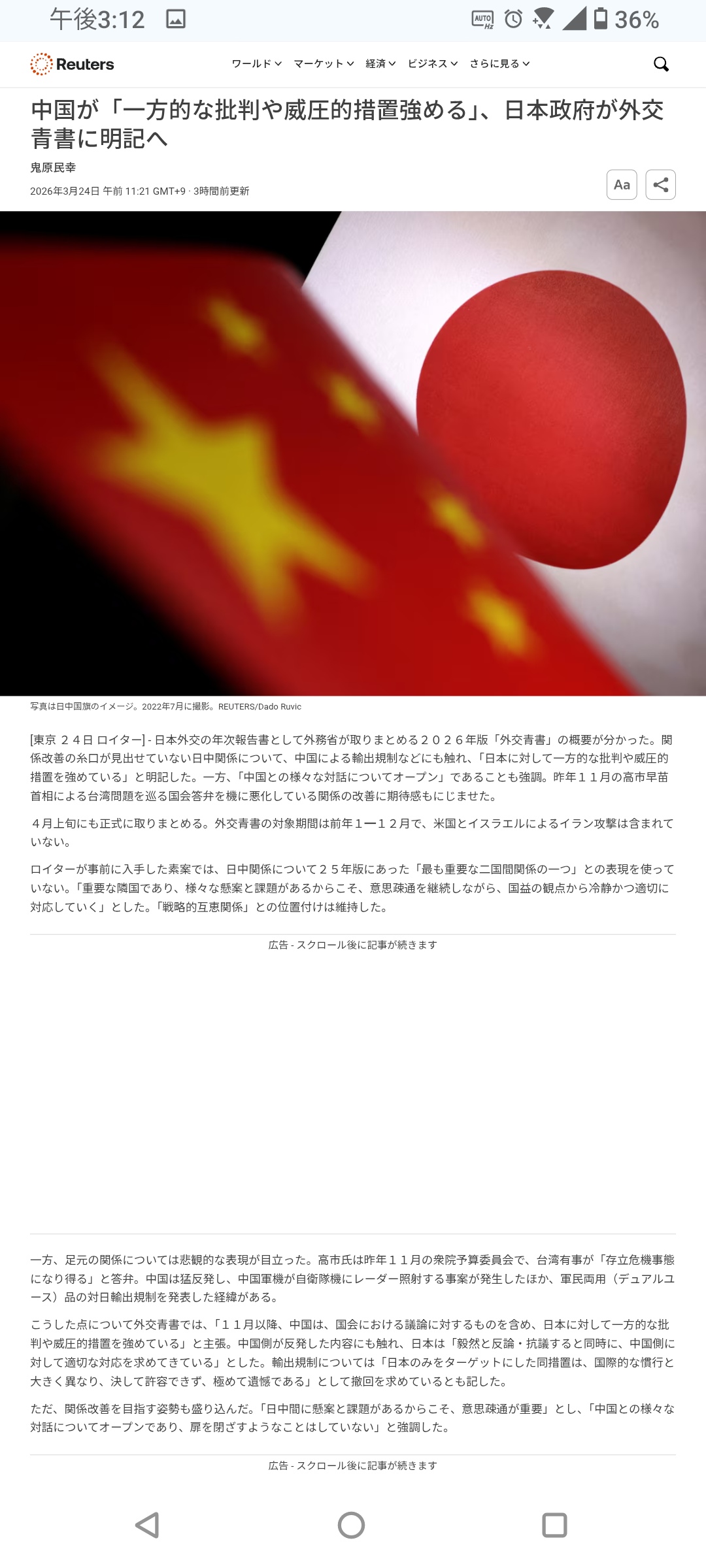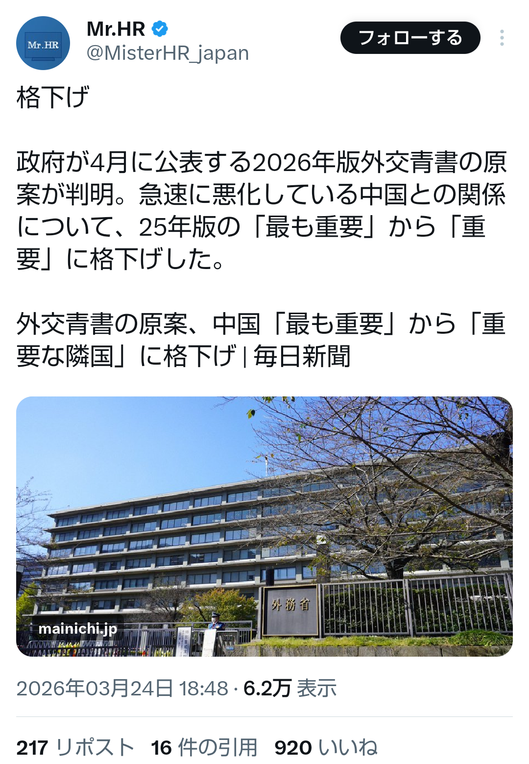 | … | 263無題Name名無し 26/03/25(水)01:06:53No.789101+ 1774368413646.png-(1213171 B) >外交青書の原案、中国「最も重要」から「重要な隣国」に格下げ | 毎日新聞 |