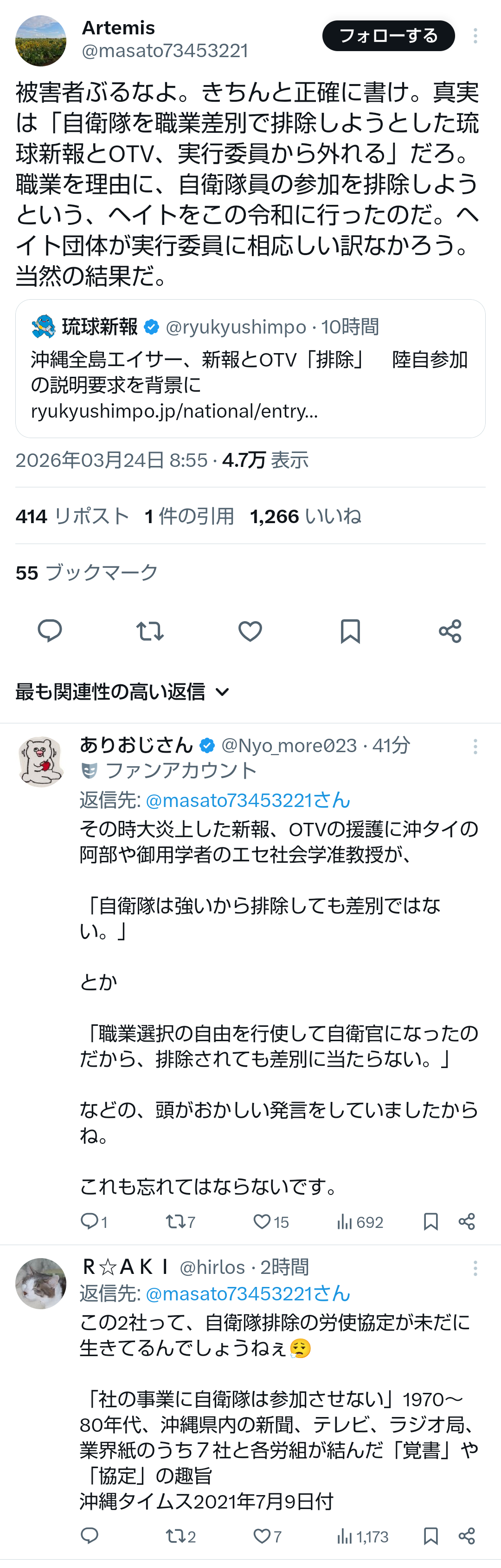 | … | 299無題Name名無し 26/03/25(水)12:21:49No.789151+ 1774408909456.png-(1630671 B) >全島エイサーまつり実行委、琉球新報と沖縄テレビを除外 自衛隊出演が背景に |