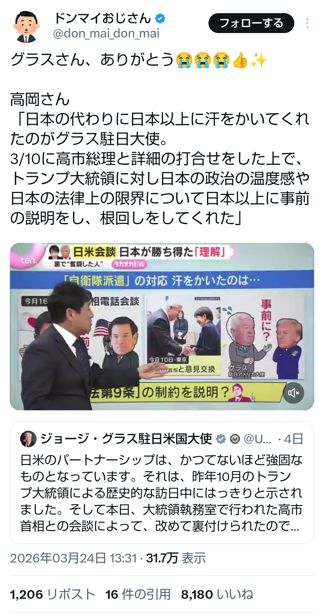 | … | 78無題Name名無し 26/03/23(月)18:19:14No.788878そうだねx3 1774257554362.png-(1450961 B) >米国連大使、高市首相が自衛隊支援を「約束」 ホルムズ海峡安全確保、日本側は否定 |