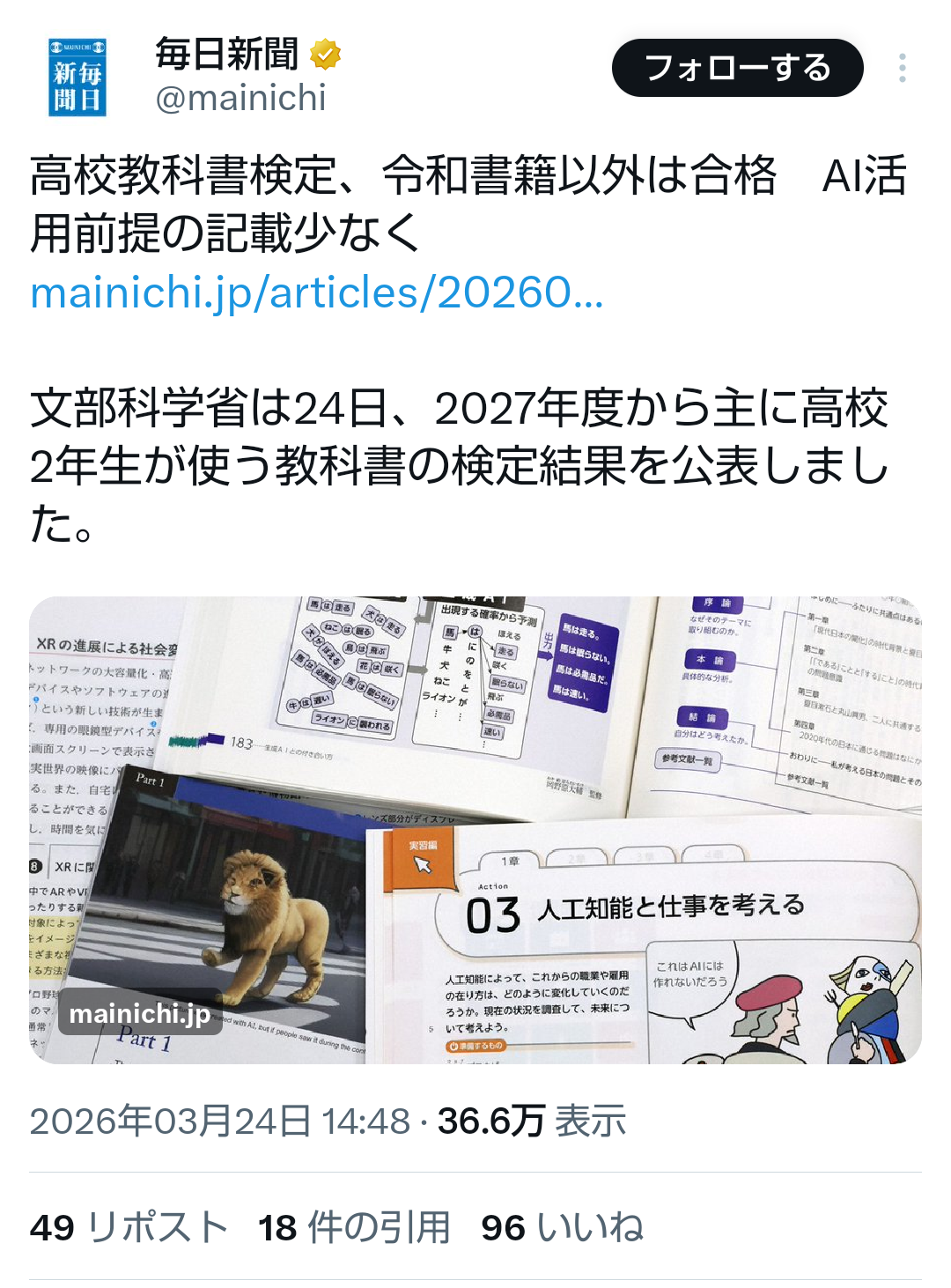 | … | 255無題Name名無し 26/03/24(火)23:22:55No.789093+ 1774362175989.png-(878185 B) 高校教科書検定、令和書籍以外は合格 AI活用前提の記載少なく |